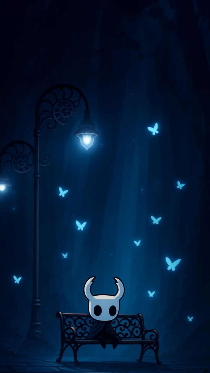 The Knight sits alone on an ornate bench beneath a glowing street lamp, surrounded by luminous blue butterflies in a mysterious dark atmosphere. A breathtaking 4K Hollow Knight fan art wallpaper.