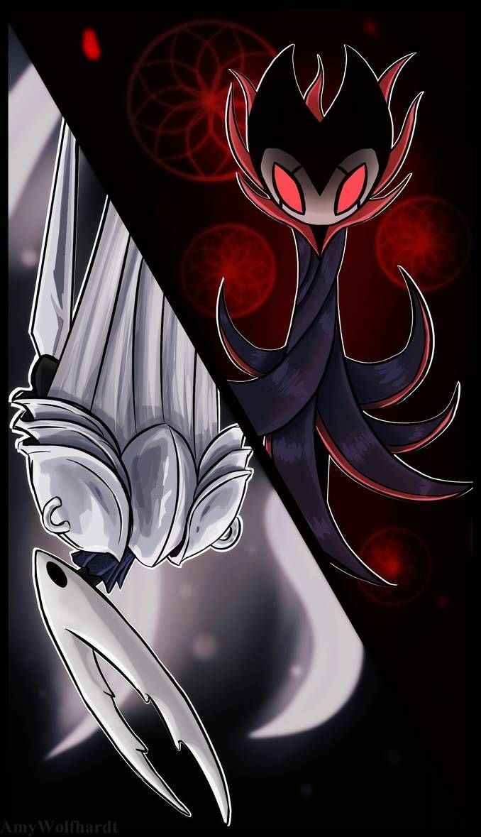 Stunning 4K Hollow Knight fan art wallpaper by AmyWolfhardt, depicting a dramatic contrast between the Pure Vessel in white and a dark, red-eyed void entity, set against a striking black and red background.