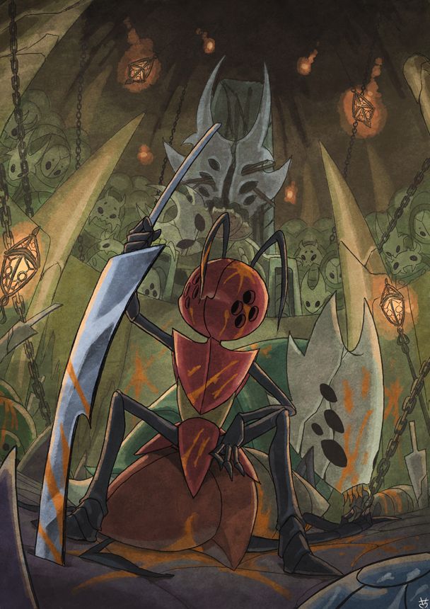 A fierce red ant-like warrior raises a massive blade against a dark, lantern-lit cavern filled with ghost enemies and a towering masked boss. Stunning 4K fan art from Hollow Knight universe.