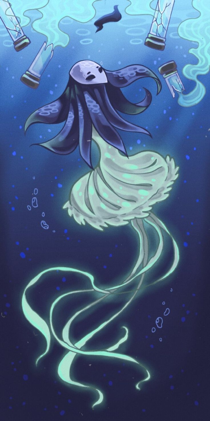 Hollow Knight wallpaper, 4K wallpaper, underwater ghost art, glowing spirit illustration, Hollow Knight fanart, high resolution wallpaper, dark fantasy artwork, anime ghost wallpaper, bioluminescent spirit, digital art wallpaper