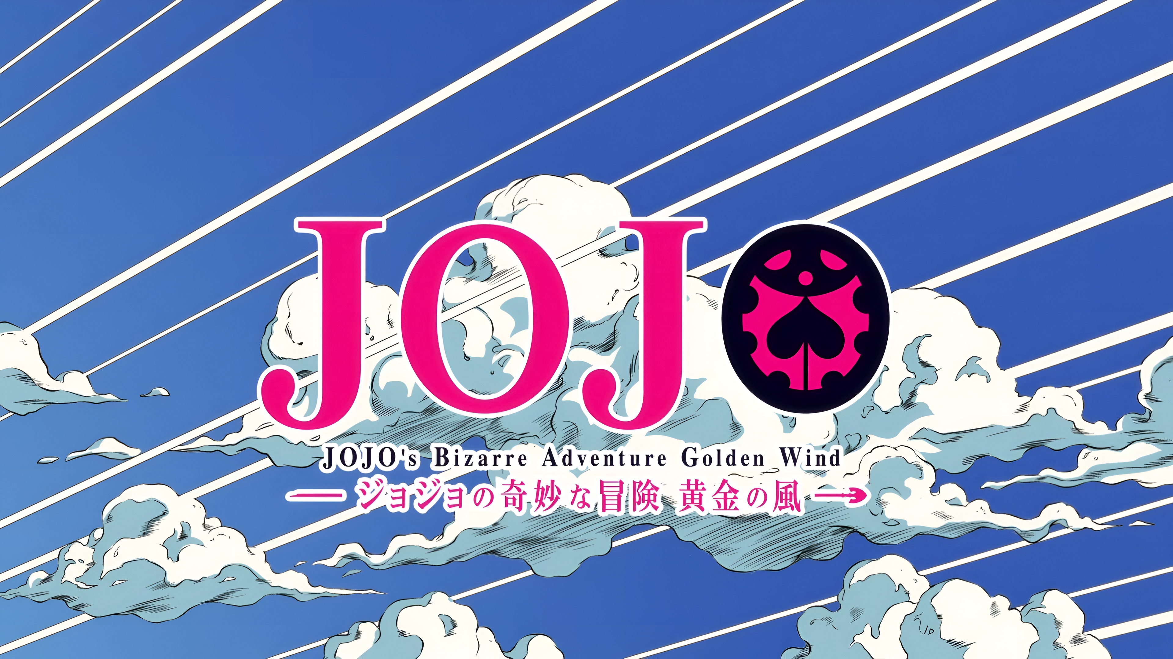Stunning 4K high-resolution wallpaper featuring the official title card of JoJo's Bizarre Adventure Golden Wind. Bold pink JOJO logo set against a dramatic anime-style blue sky with dynamic clouds and speed lines.