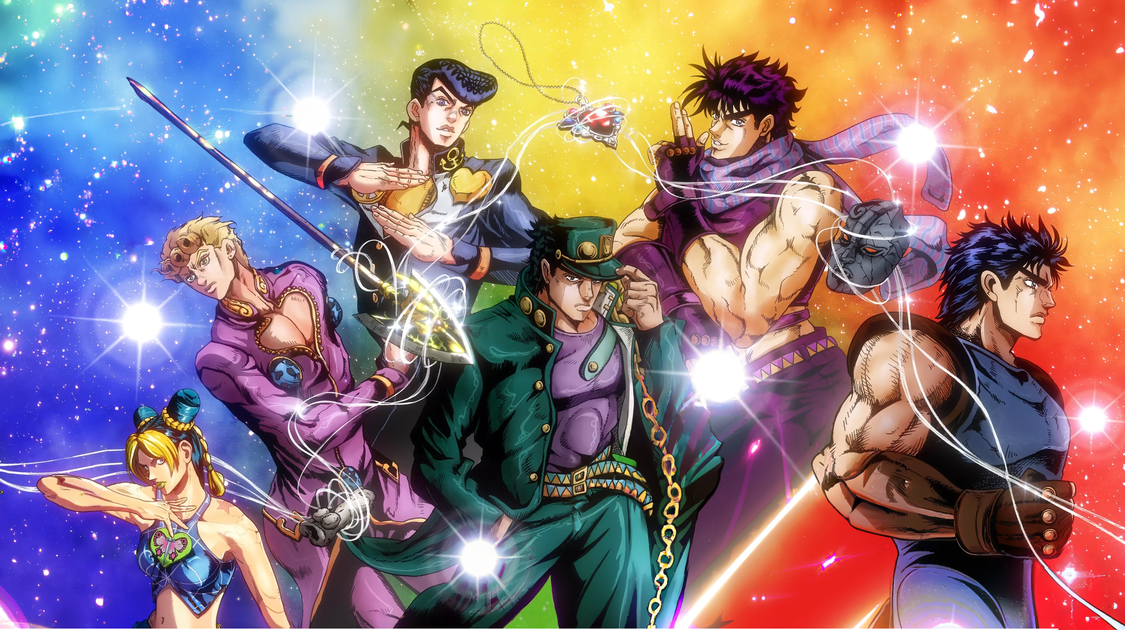 Stunning 4K wallpaper featuring iconic JoJo's Bizarre Adventure characters in dynamic poses against a vibrant rainbow cosmic background. High-resolution artwork showcasing legendary JoJo protagonists with glowing energy effects and signature styles.