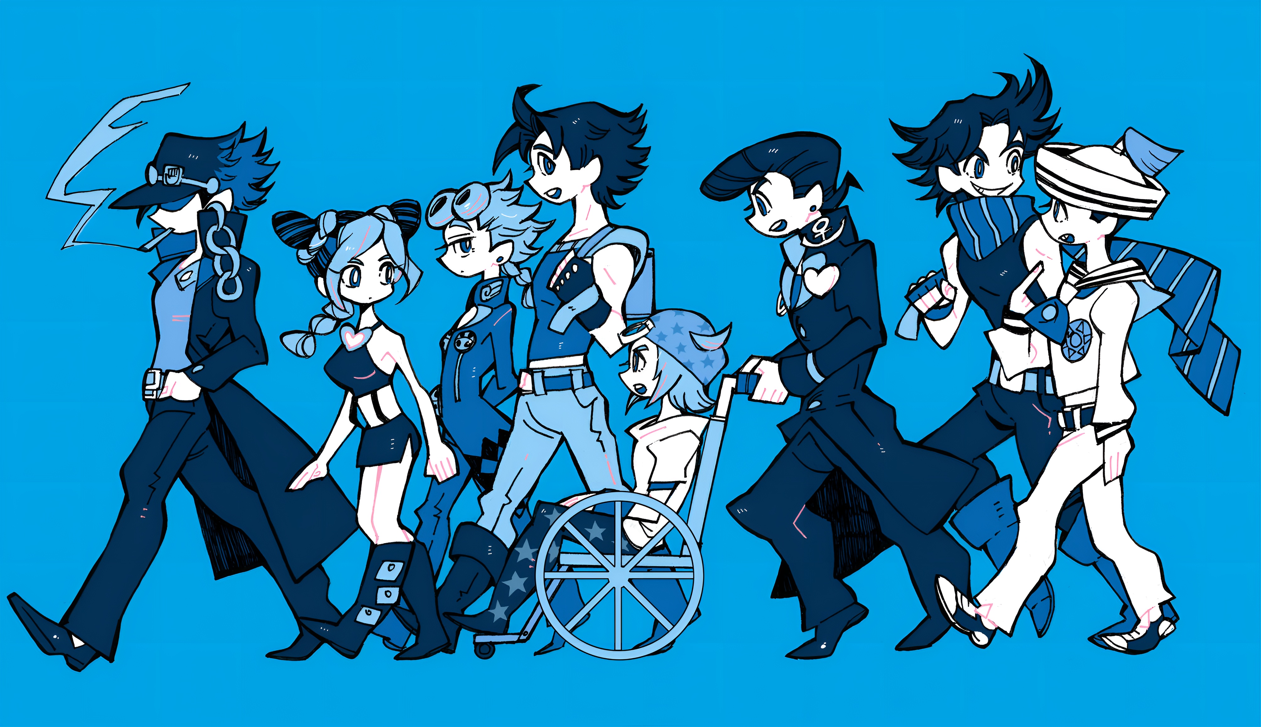 JoJo's Bizarre Adventure, Stardust Crusaders, anime wallpaper, chibi art style, blue aesthetic, 4K wallpaper, high resolution, anime characters, manga art, group illustration