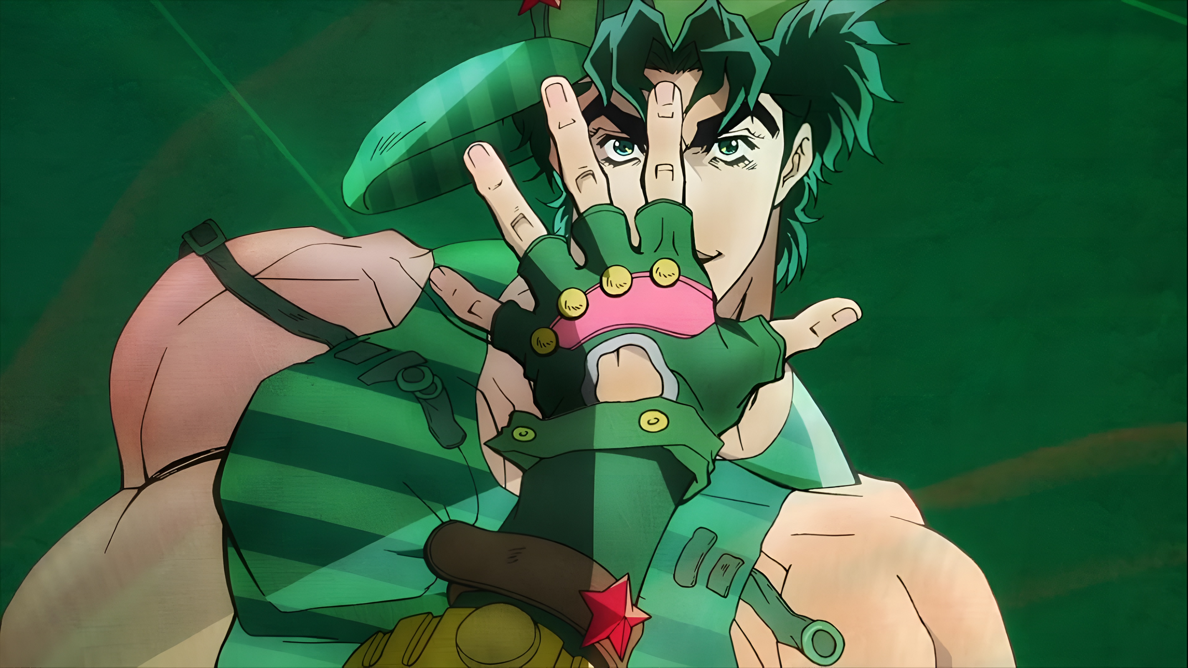 High-resolution 4K wallpaper featuring Jonathan Joestar from JoJo's Bizarre Adventure. The muscular hero strikes a dramatic pose in his iconic green outfit with fingerless gloves, set against a vibrant green background.