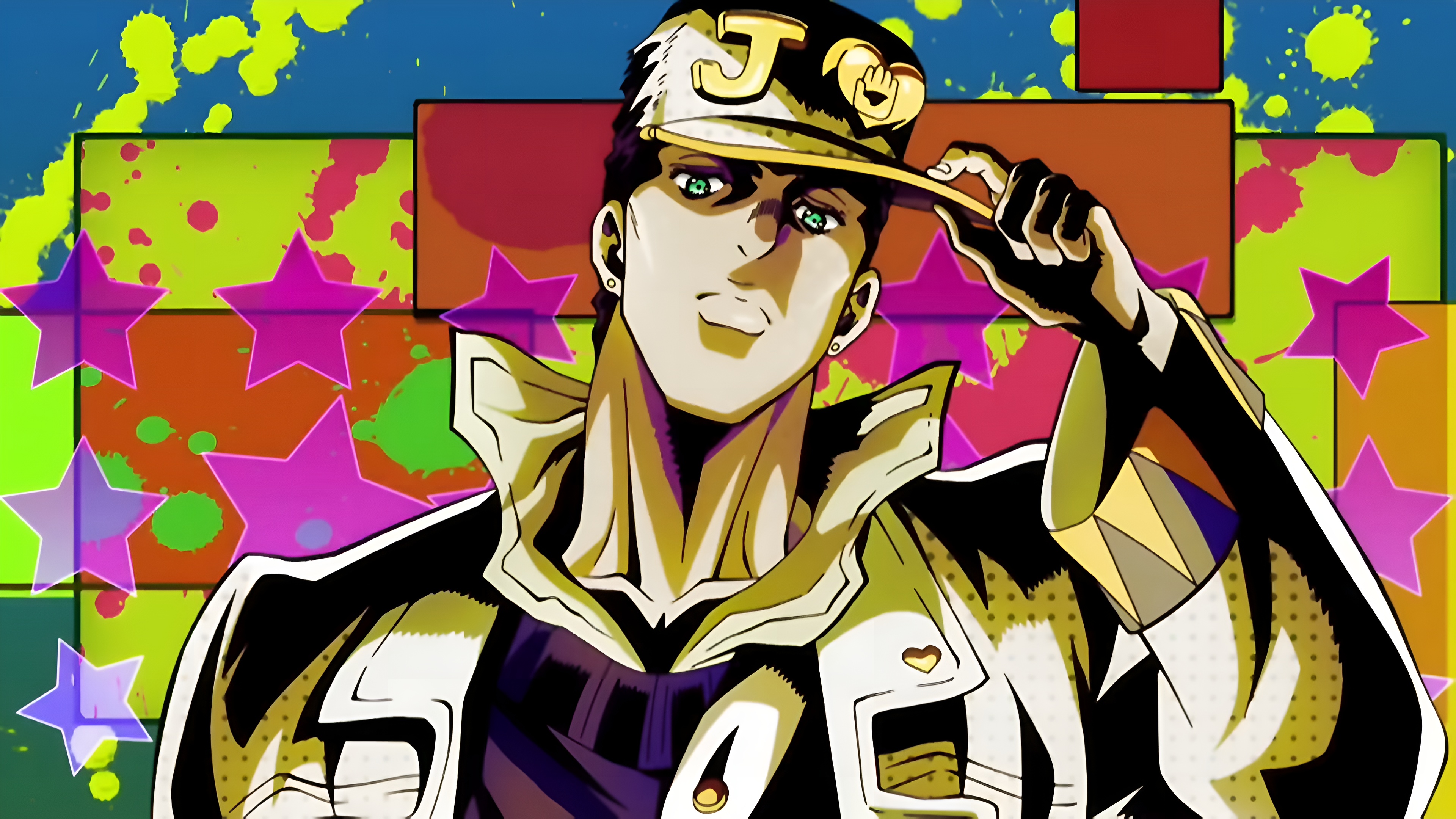 High-resolution 4K wallpaper featuring Jotaro Kujo from JoJo's Bizarre Adventure. Bold anime art style with vibrant colorful background, stars, and paint splashes. Jotaro tips his iconic cap with a confident expression.