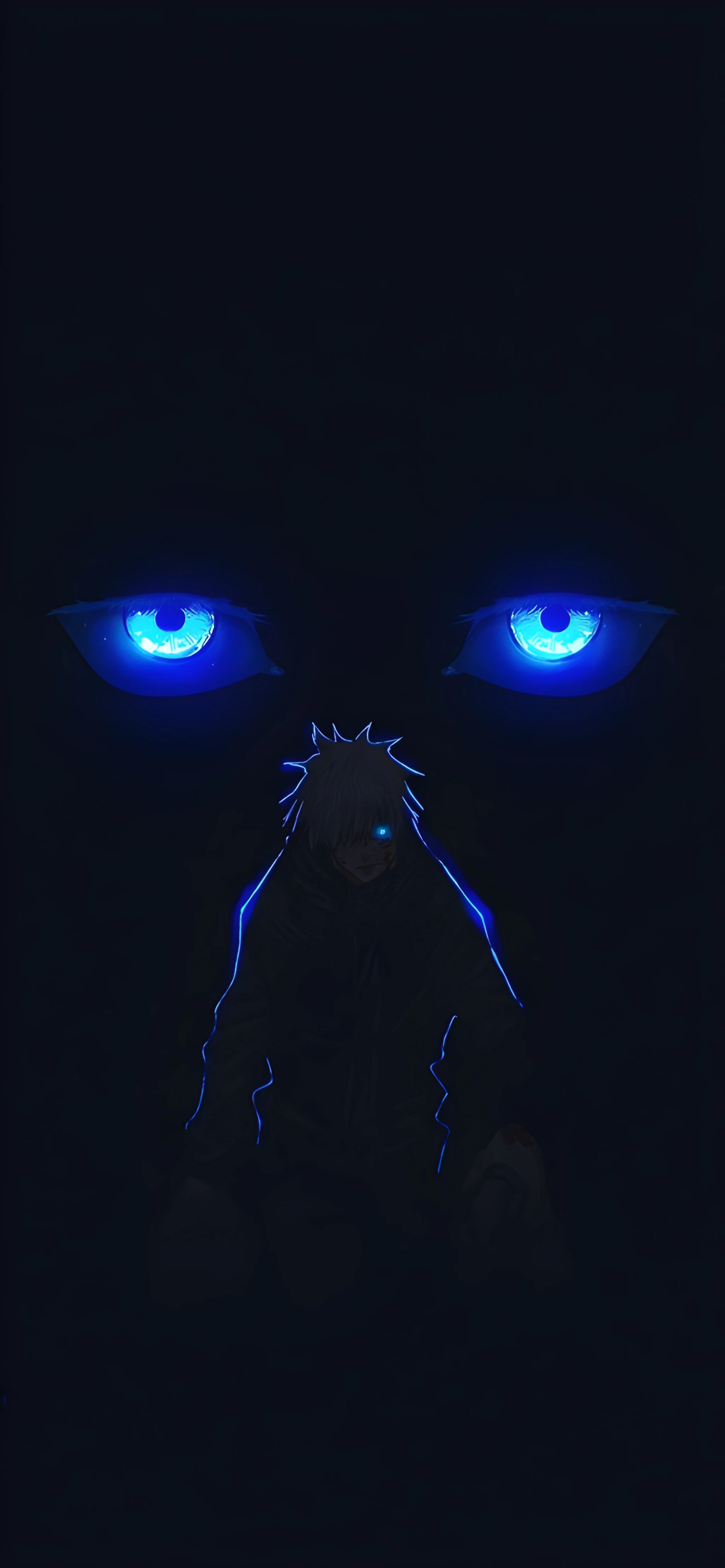 Jujutsu Kaisen wallpaper, Gojo Satoru, glowing blue eyes, 4K anime wallpaper, dark anime aesthetic, neon blue, high resolution, anime wallpaper, ultra HD, Jujutsu Kaisen 4K