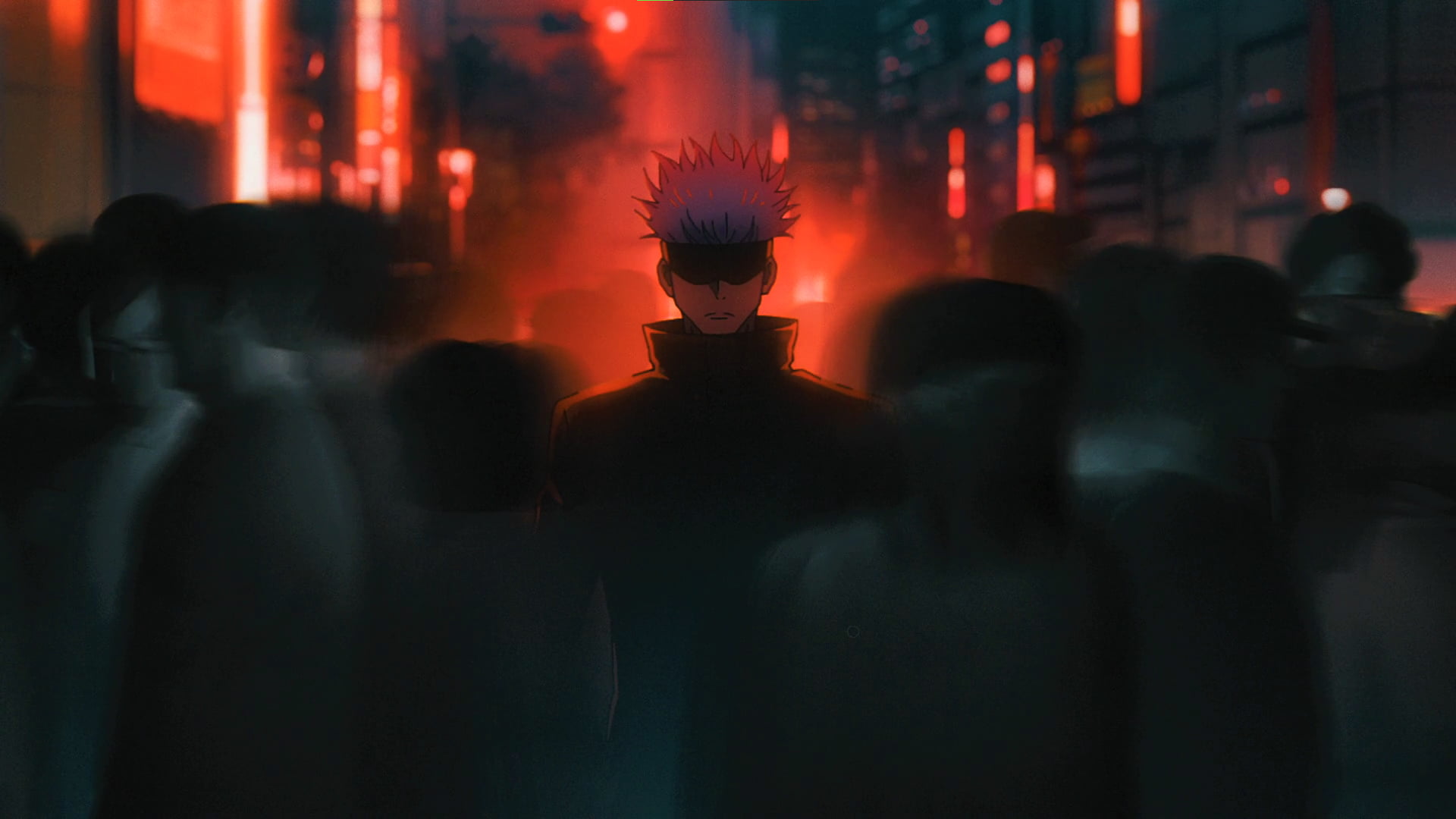 Yuji Itadori stands alone in a dark, neon-lit Tokyo street surrounded by silhouetted crowds. Dramatic red lighting creates a cinematic atmosphere, showcasing the protagonist's intense presence in stunning 4K ultra-high-resolution anime art.