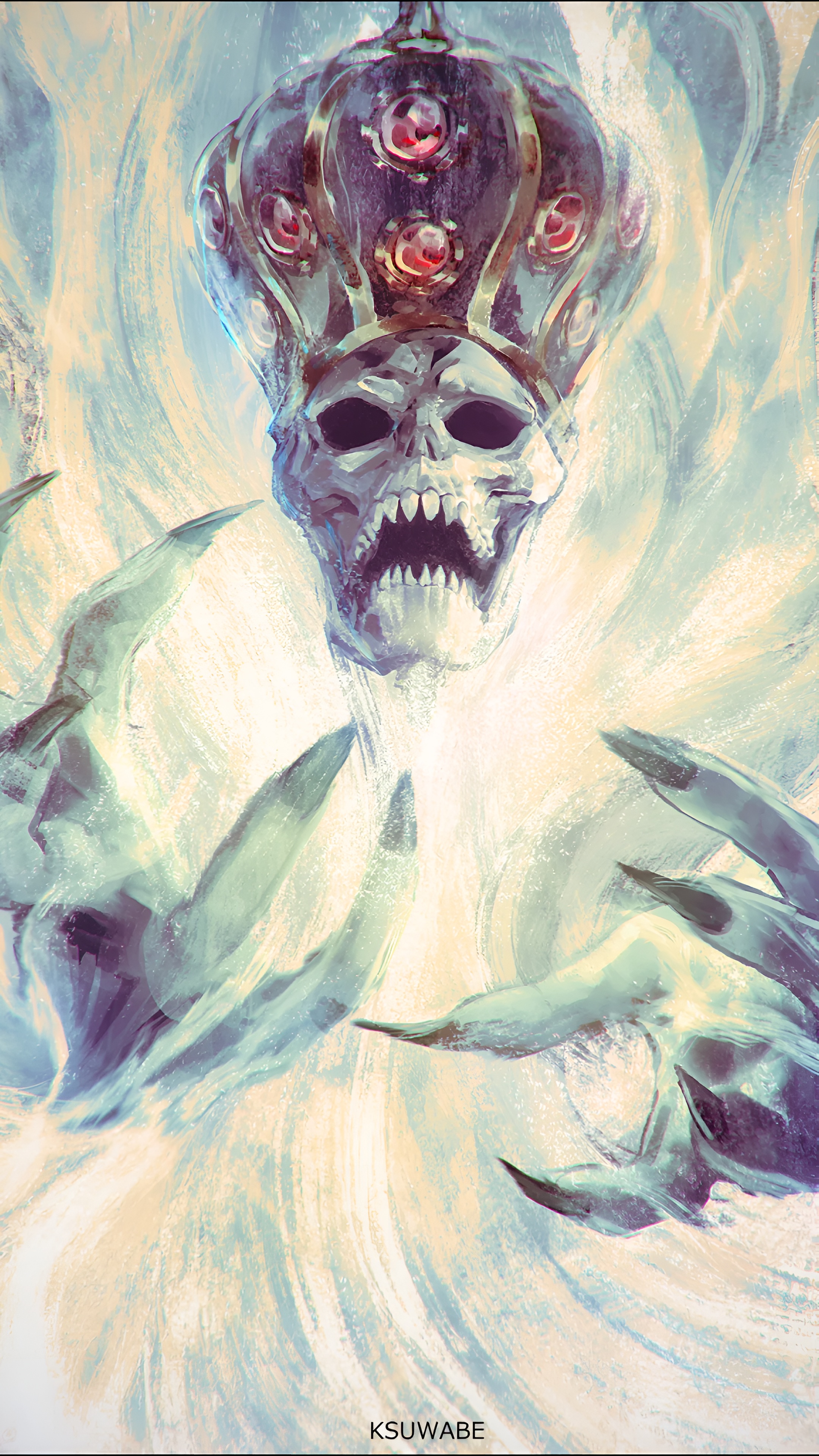 Stunning high-resolution digital artwork of Justice, the Stand from JoJo's Bizarre Adventure. A haunting skull-faced entity wearing a jeweled crown, emanating ethereal energy with sharp claws, rendered in breathtaking 4K detail.