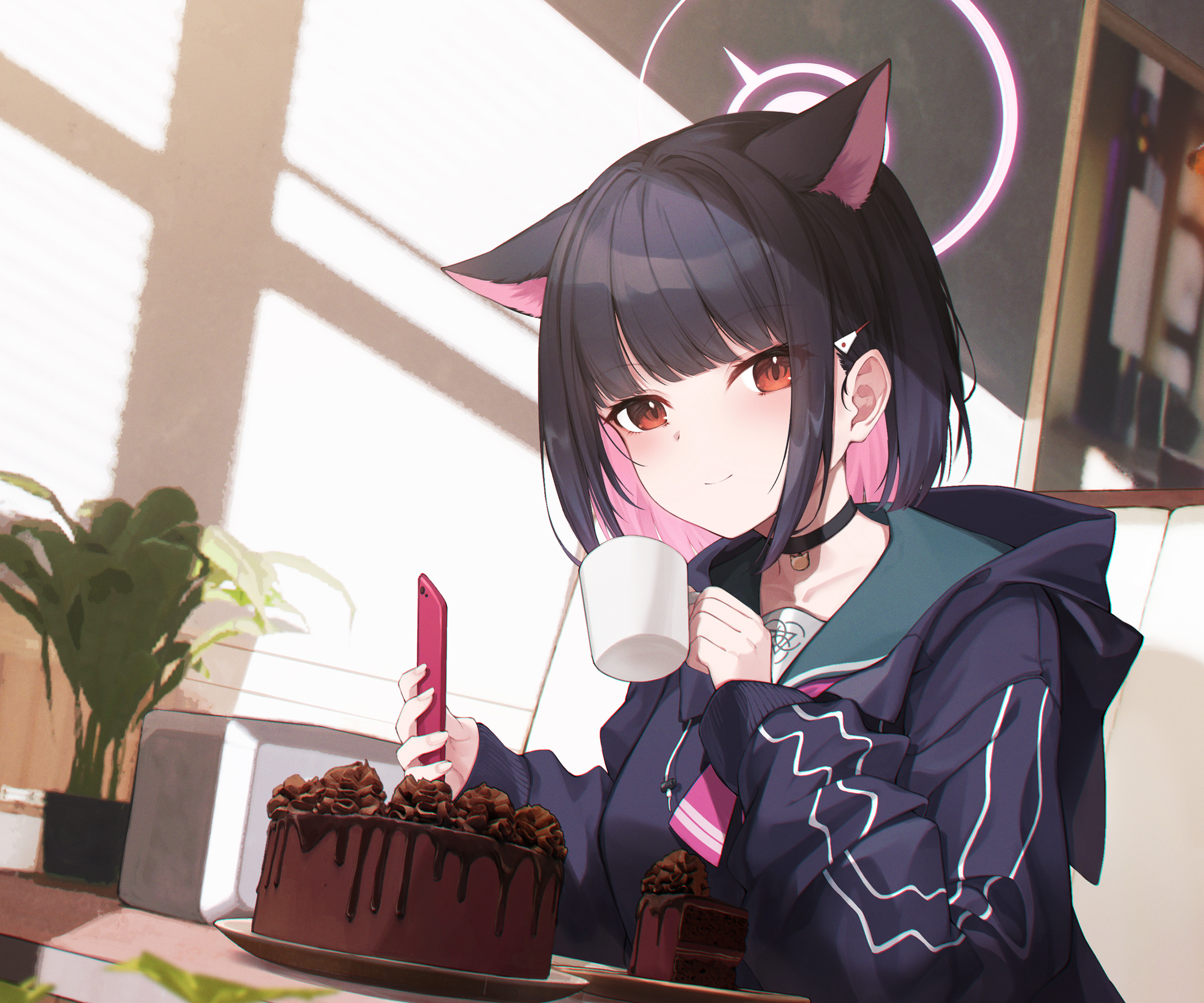 Kyouyama Kazusa from Blue Archive enjoying coffee and chocolate cake at a sunlit cafe, holding a pink smartphone. Stunning 4K anime artwork featuring her signature cat ears and red eyes.