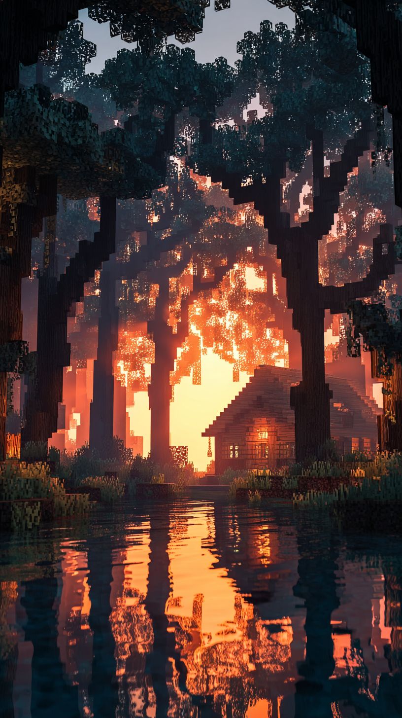 A breathtaking Minecraft sunset scene featuring a cozy cabin nestled among towering trees, with warm golden light reflecting on a serene water surface. Perfect high-resolution wallpaper for Minecraft enthusiasts.