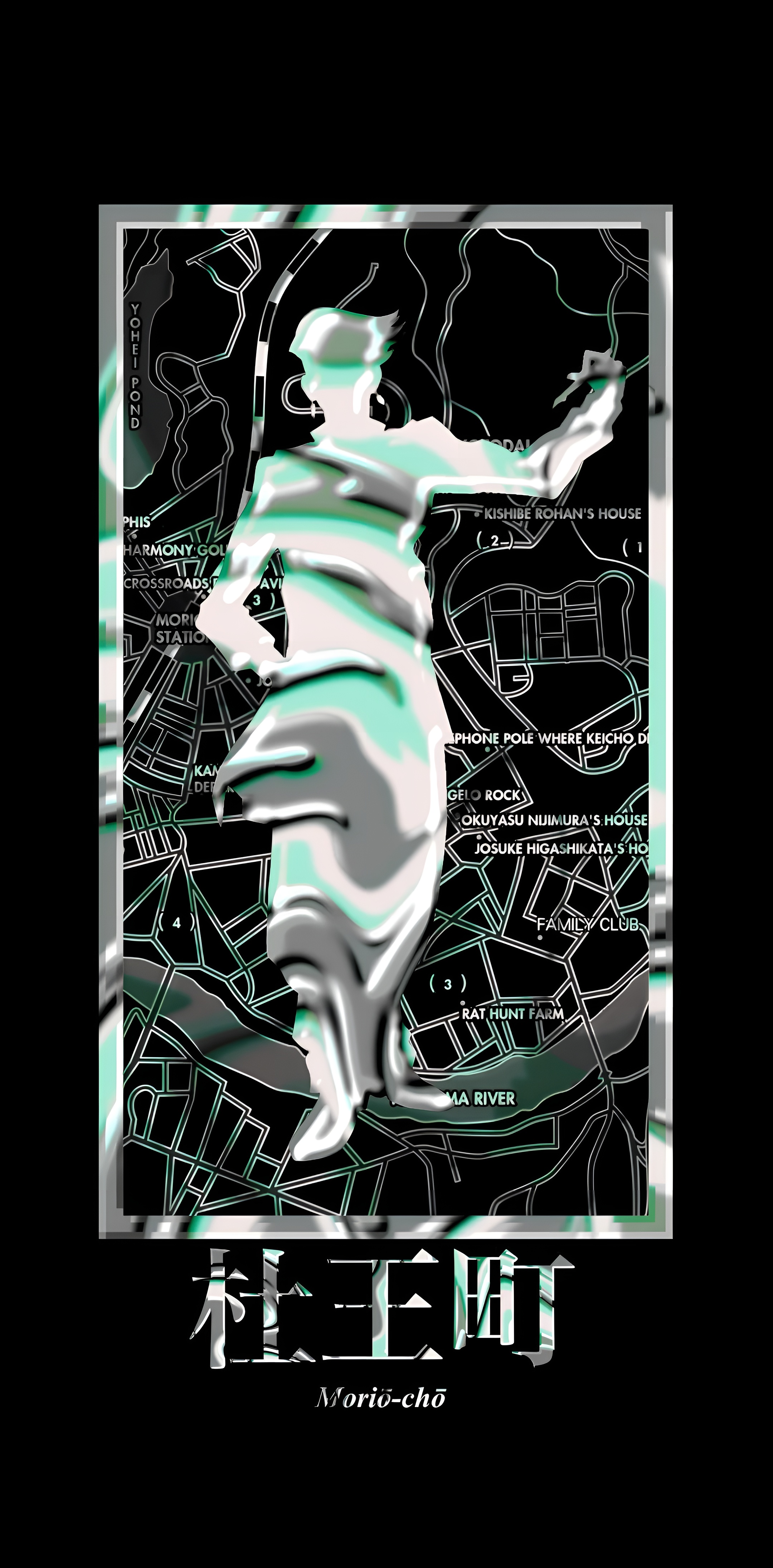 JoJo's Bizarre Adventure wallpaper, Rohan Kishibe wallpaper, Morio-cho map, Diamond is Unbreakable, 4K anime wallpaper, high resolution anime art, dark anime aesthetic, chrome silhouette, neon green anime, Part 4 wallpaper
