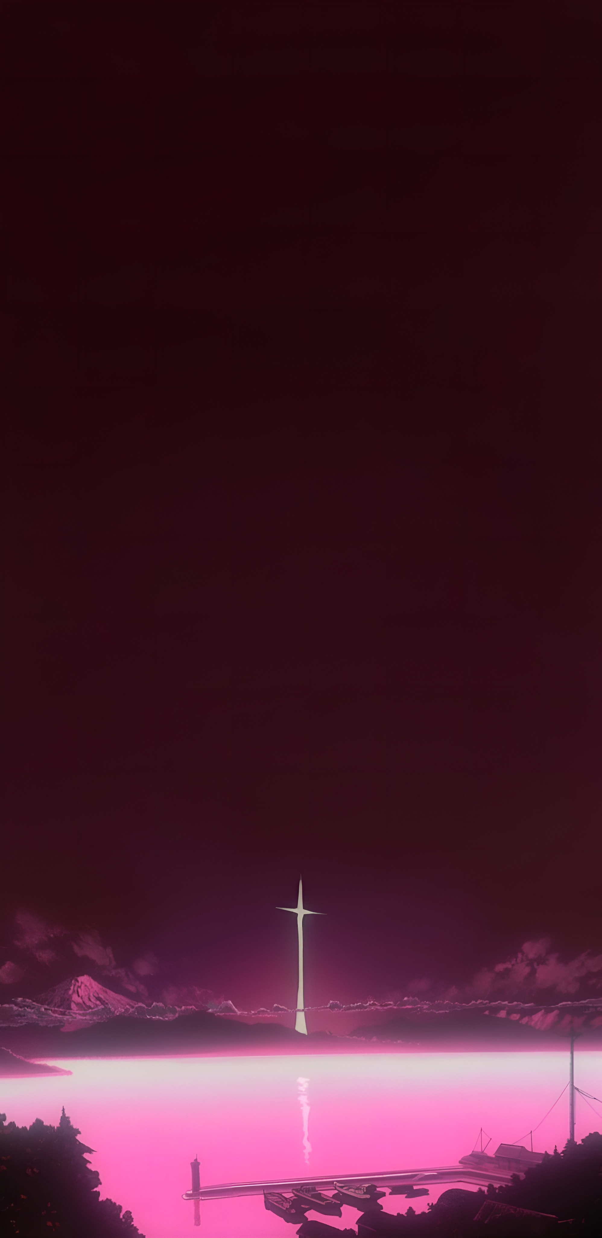 A stunning 4K phone wallpaper inspired by Neon Genesis Evangelion, featuring a glowing pink horizon with a cross silhouette rising against a dark crimson sky, reflecting on a serene water surface.