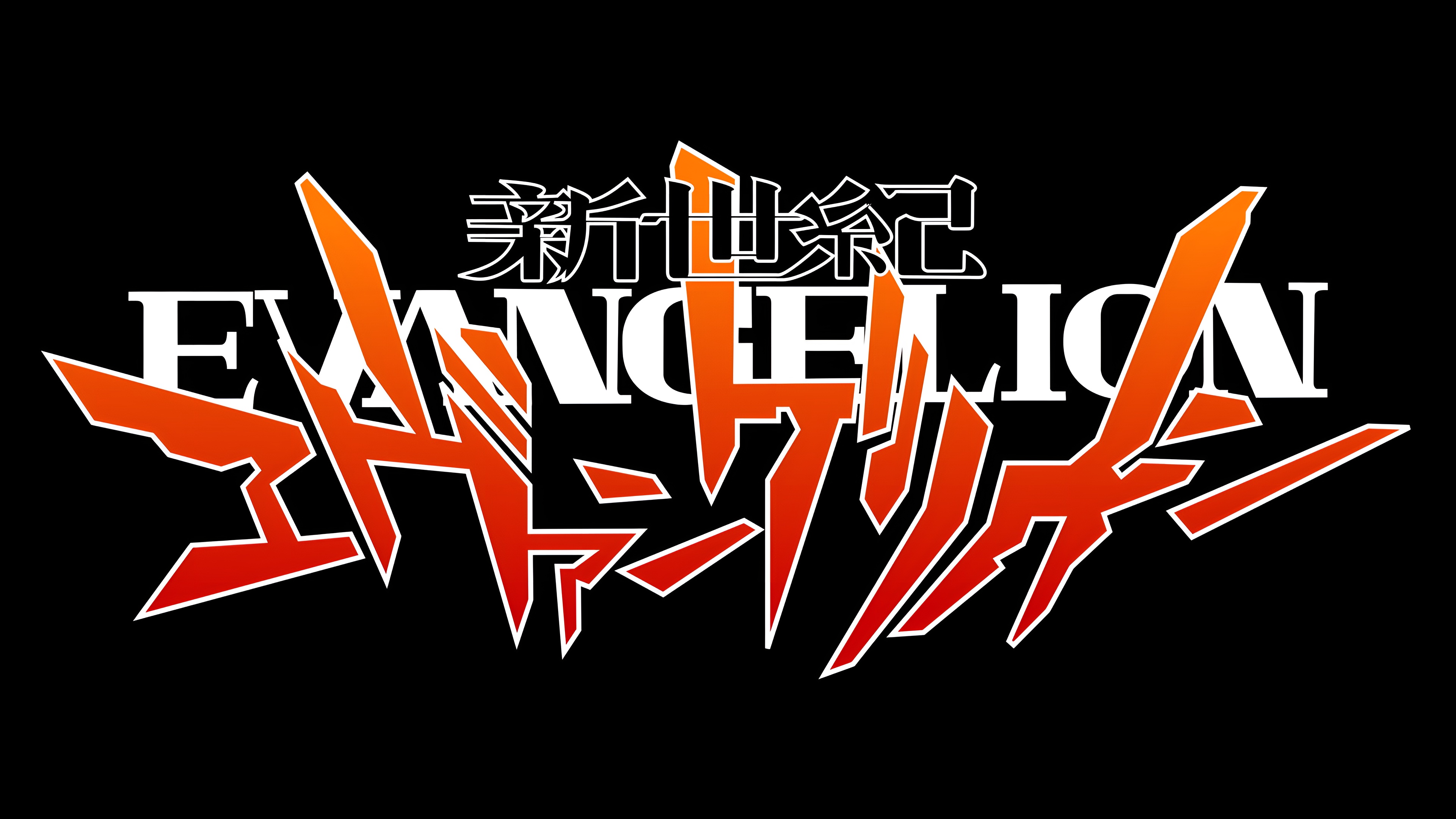 High-resolution 4K wallpaper featuring the iconic Neon Genesis Evangelion logo with bold orange-red katakana and kanji characters against a sleek black background, perfect for anime fans and desktop customization.