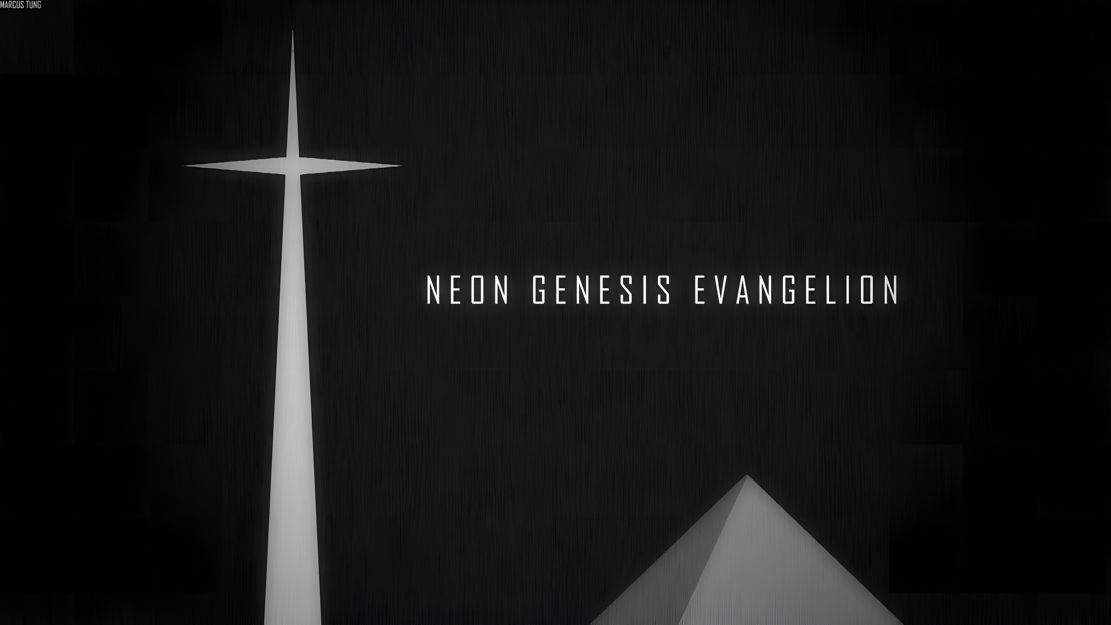 A sleek, minimalist Neon Genesis Evangelion wallpaper featuring a iconic cross spear and pyramid shapes on a dark textured background. Perfect for fans seeking a high-resolution, cinematic desktop aesthetic.