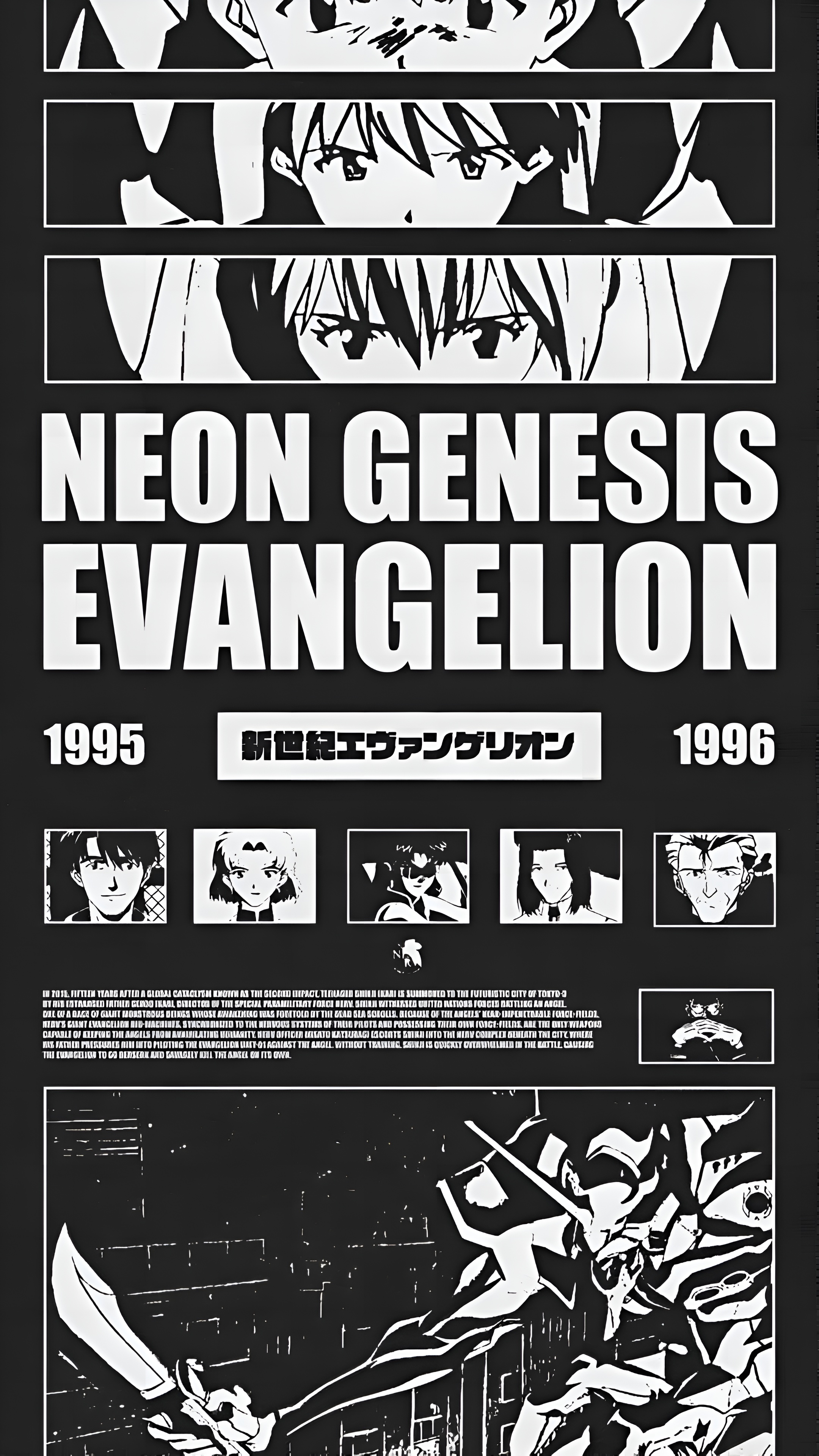 Stunning 4K high-resolution Neon Genesis Evangelion phone wallpaper featuring iconic characters and EVA Unit-01 in a bold black and white aesthetic design. Perfect for anime fans seeking a minimalist yet powerful mobile wallpaper.