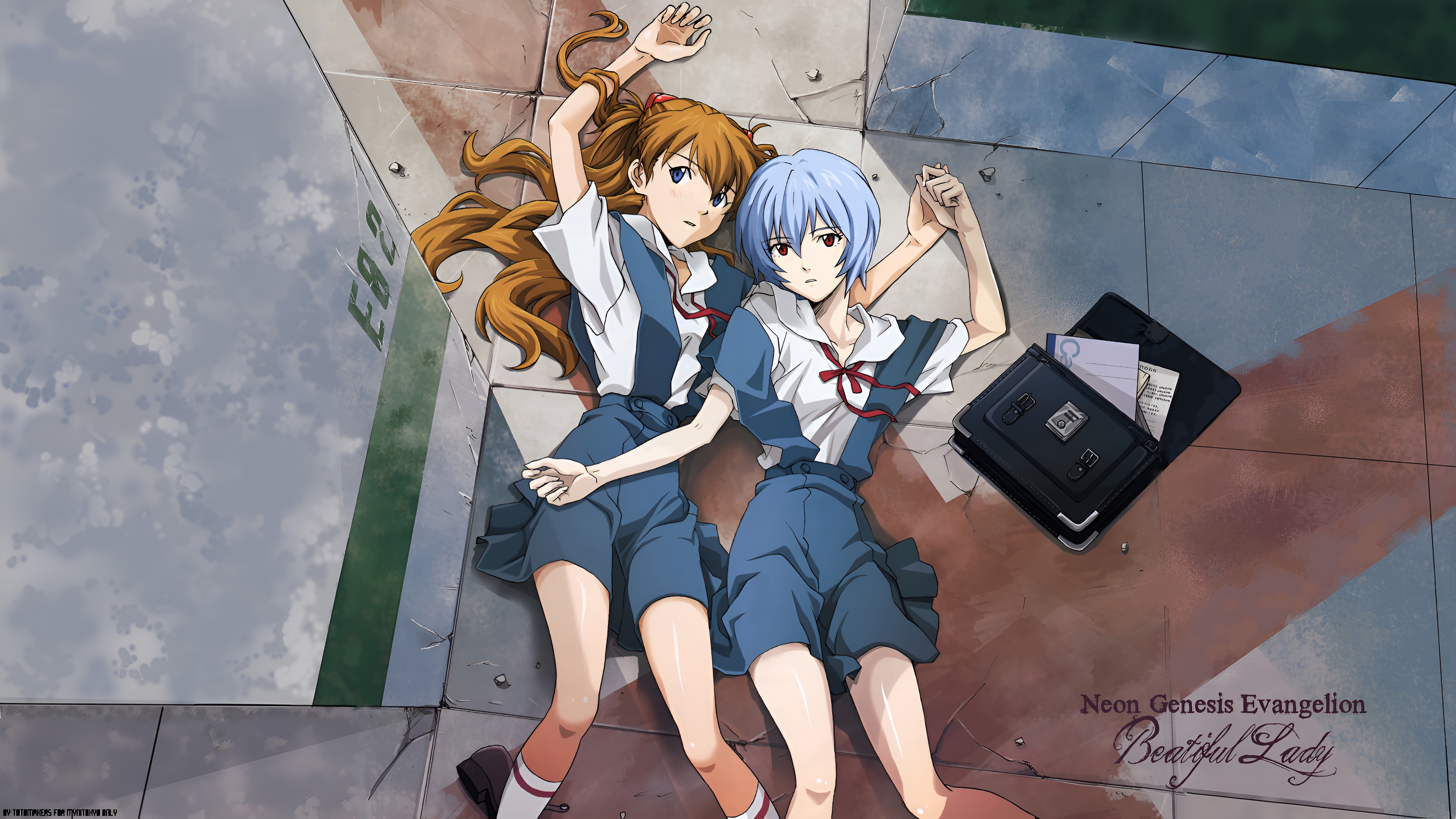 High-resolution 4K wallpaper featuring Rei Ayanami and Asuka Langley from Neon Genesis Evangelion, lying on the ground in school uniforms, showcasing stunning anime artwork with vibrant colors and detailed illustration.