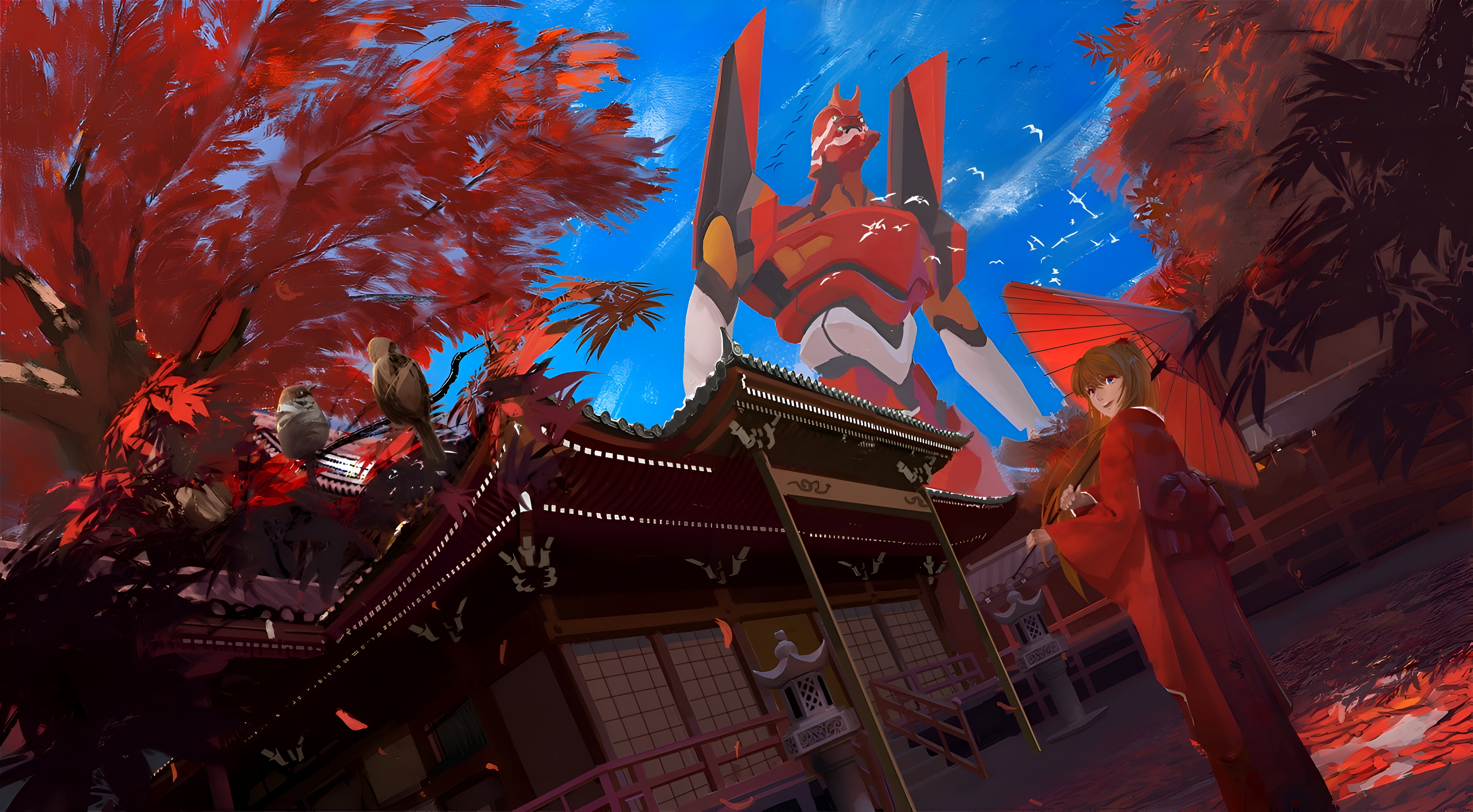 A stunning 4K anime wallpaper featuring Eva Unit-02 looming over a traditional Japanese shrine, surrounded by vivid red maple trees. A girl in a red kimono holds a parasol, creating a breathtaking fusion of ancient and futuristic aesthetics.