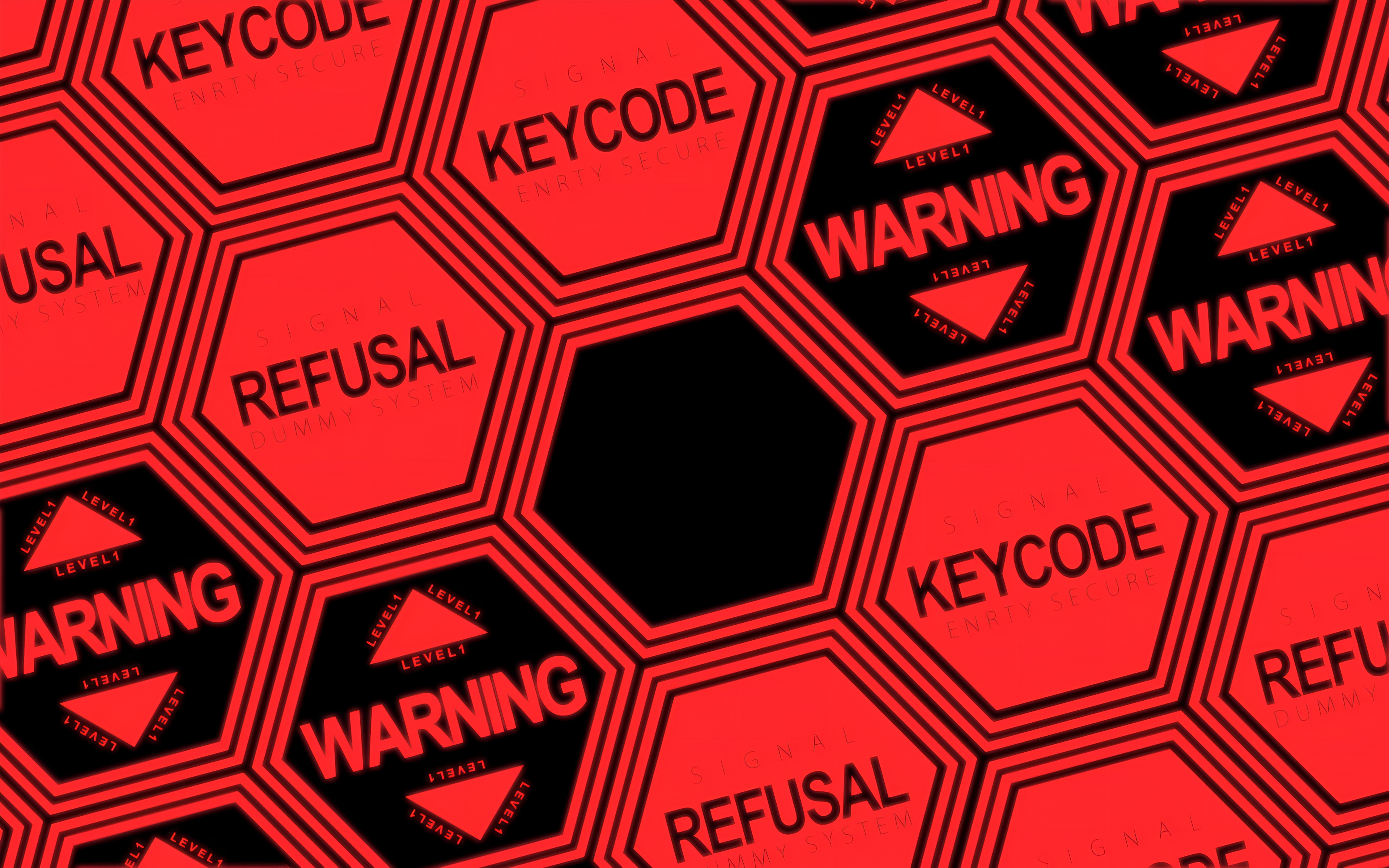 High-resolution 4K wallpaper inspired by Neon Genesis Evangelion featuring bold red hexagonal panels with warning signs, keycodes, and refusal signals on a dark background, perfect for desktop customization.