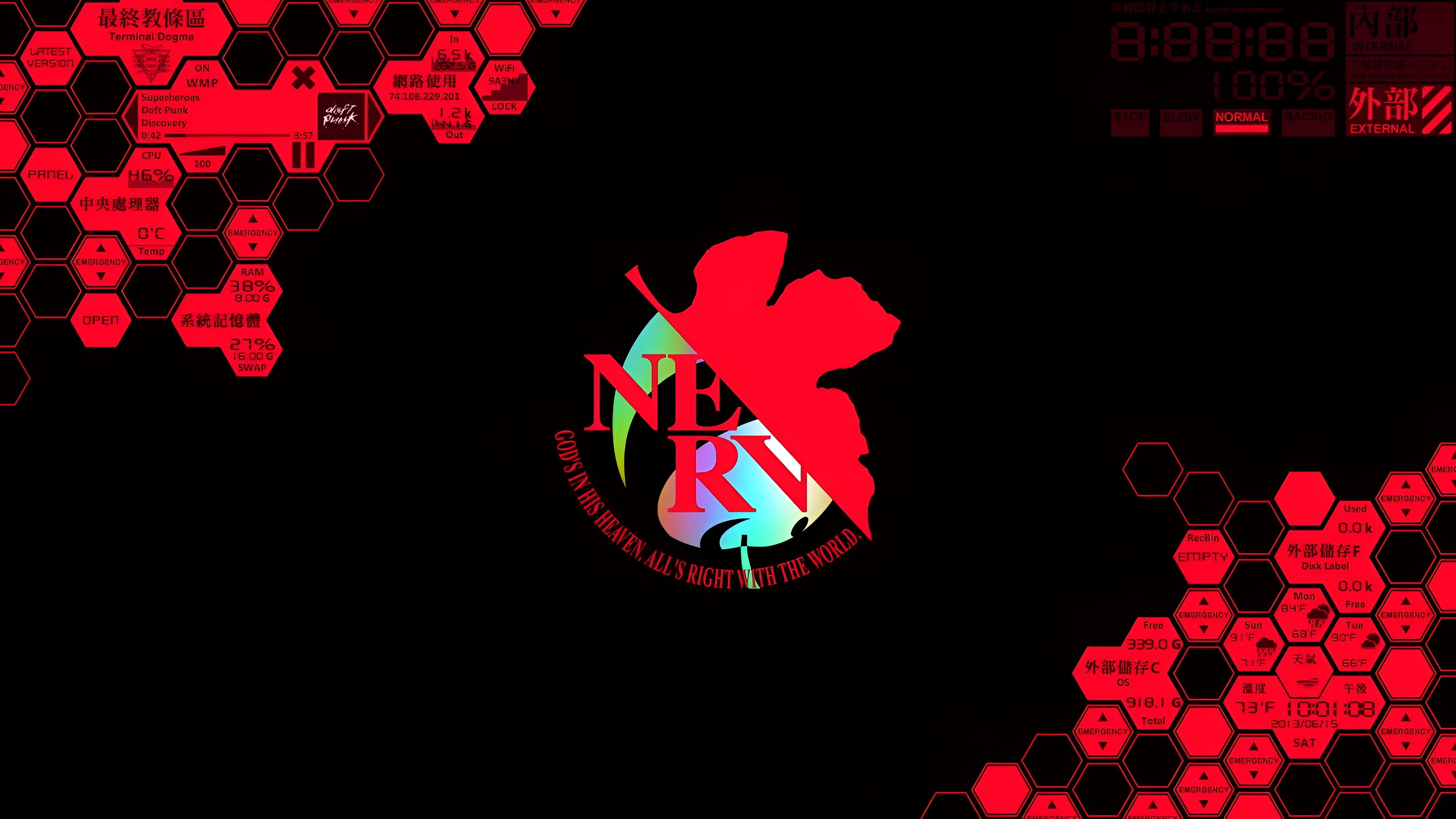 A stunning 4K high-resolution Neon Genesis Evangelion wallpaper featuring the iconic NERV logo with the motto 'God's in His Heaven, All's Right With The World,' set against a dark cyberpunk-themed interface with red hexagonal panels.