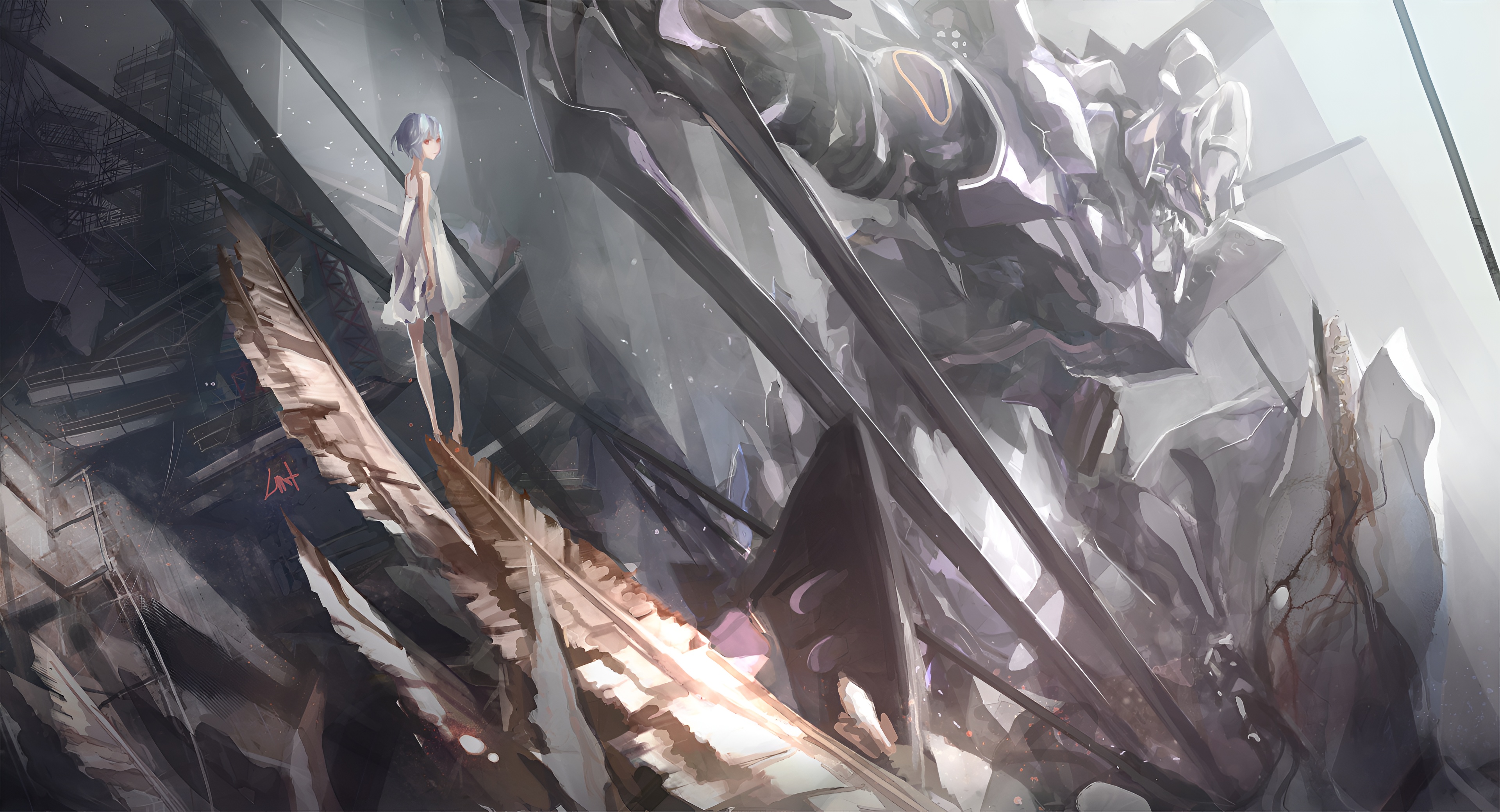 Stunning 4K wallpaper featuring Rei Ayanami standing on crumbling stairs before the massive EVA-01 unit from Neon Genesis Evangelion. A breathtaking high-resolution anime art piece with dramatic lighting and post-apocalyptic atmosphere.