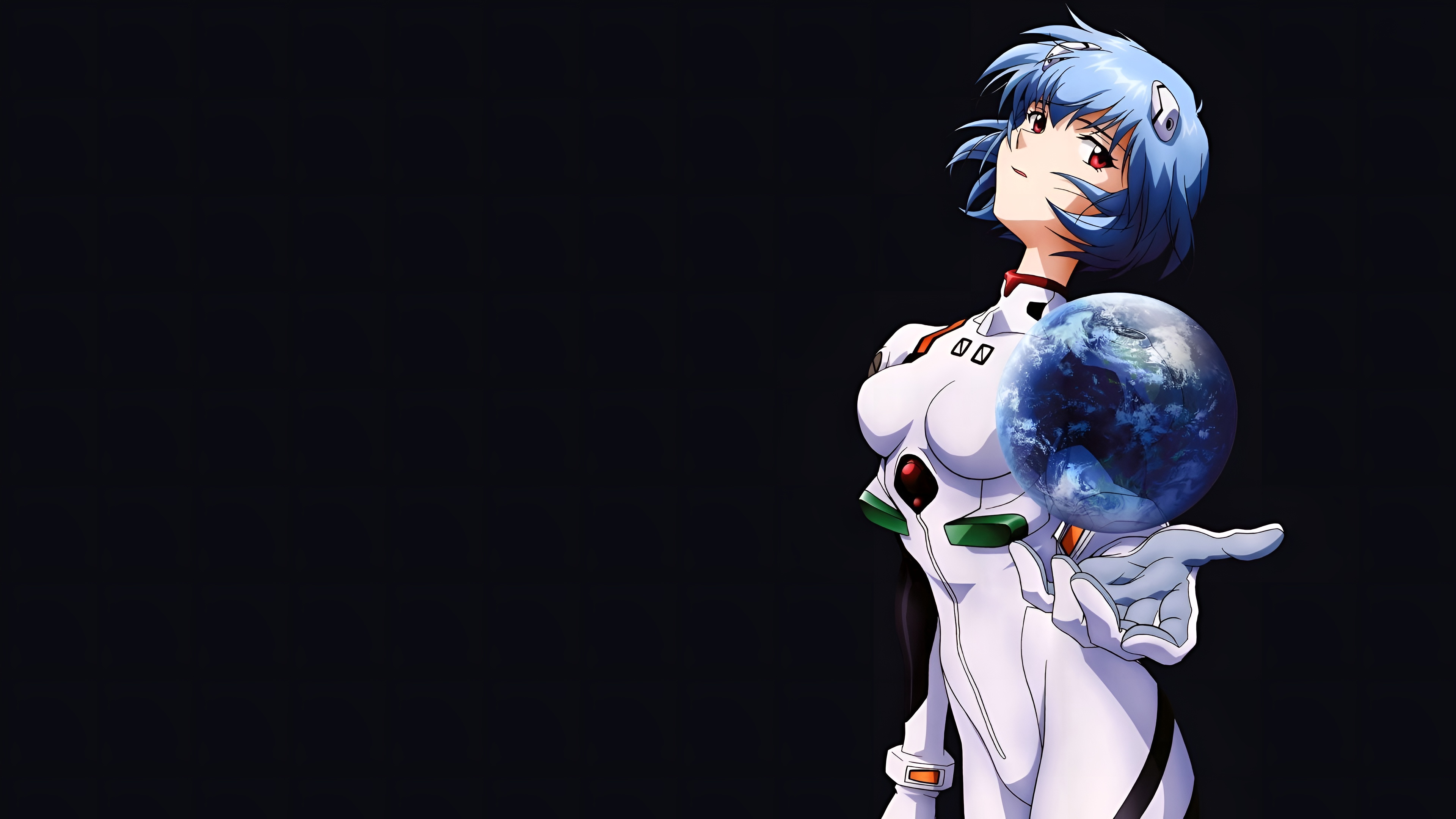Rei Ayanami from Neon Genesis Evangelion in her iconic white plugsuit, holding a glowing Earth against a dark background. A stunning 4K high-resolution anime wallpaper with dramatic lighting and detail.