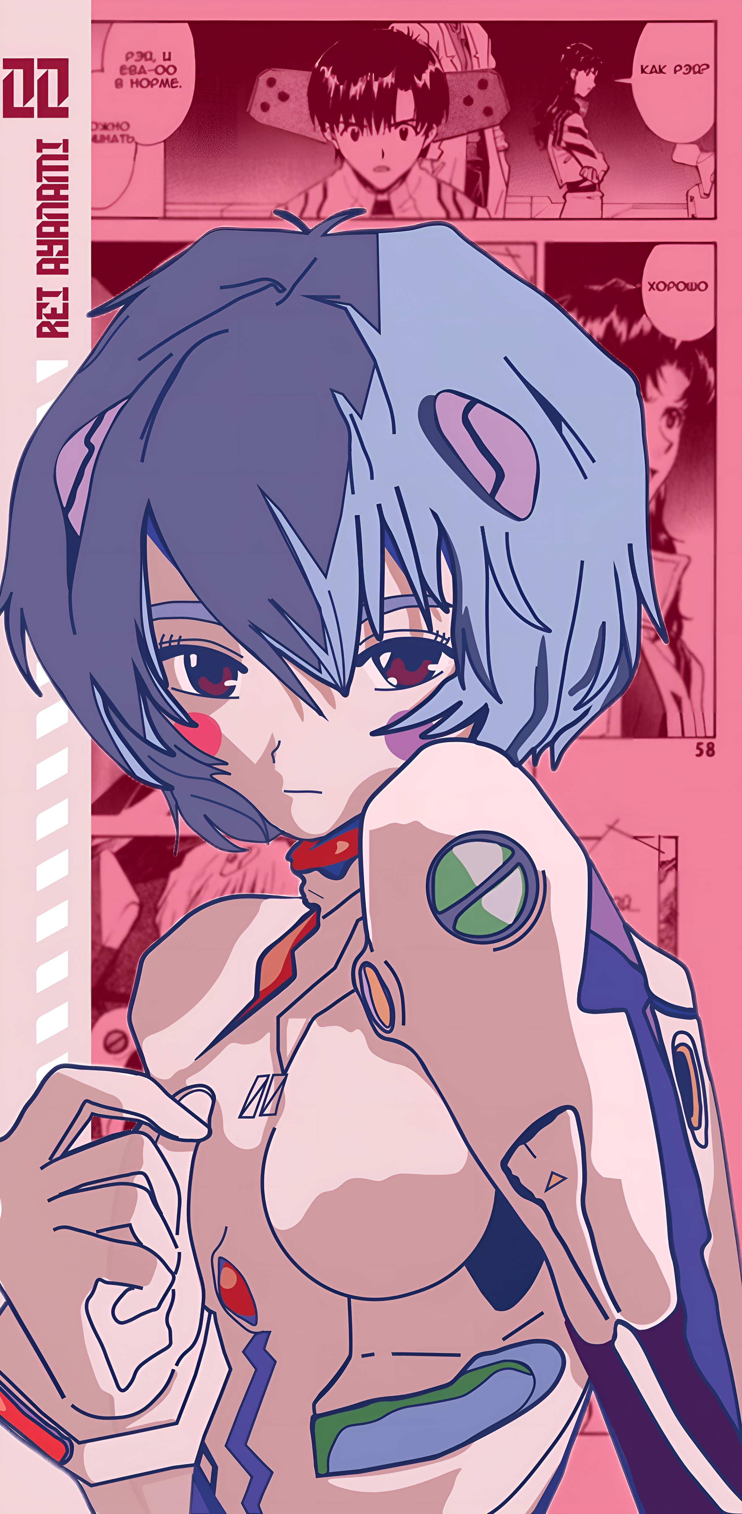 Stunning 4K phone wallpaper featuring Rei Ayanami from Neon Genesis Evangelion in her iconic plugsuit. Set against a pink manga-style background with Russian text panels, this high-resolution artwork captures Rei's mysterious and stoic essence.