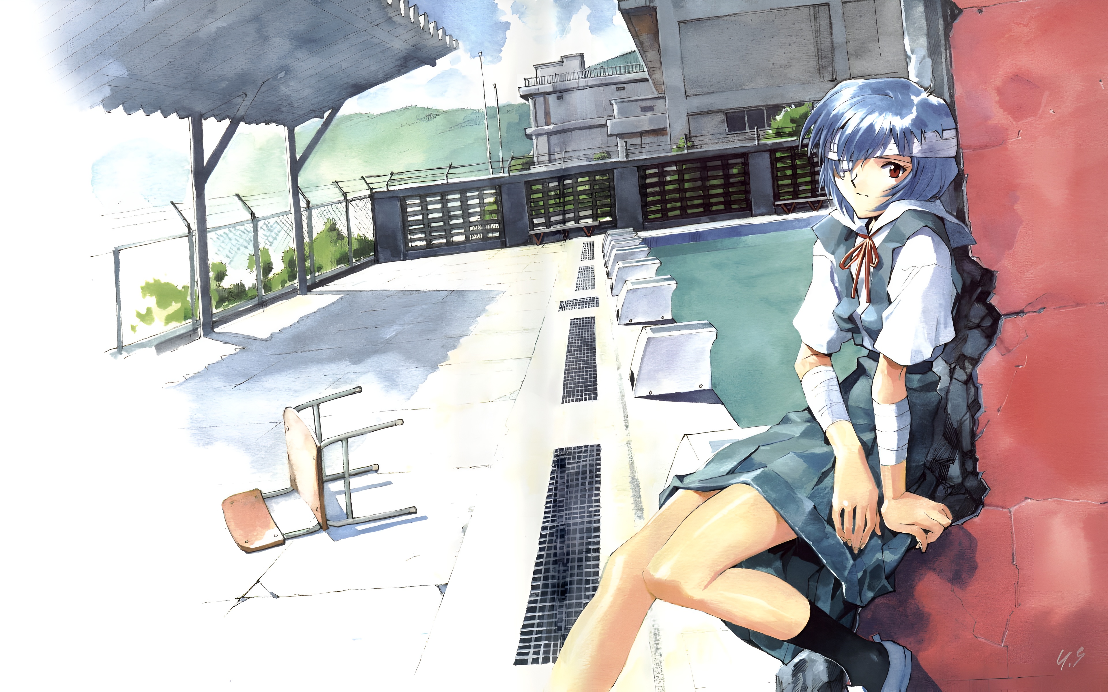 Rei Ayanami wallpaper, Neon Genesis Evangelion wallpaper, 4K anime wallpaper, high resolution EVA art, Rei Ayanami rooftop, NGE anime art, blue hair anime girl, watercolor anime wallpaper, Evangelion school uniform, ultra HD anime