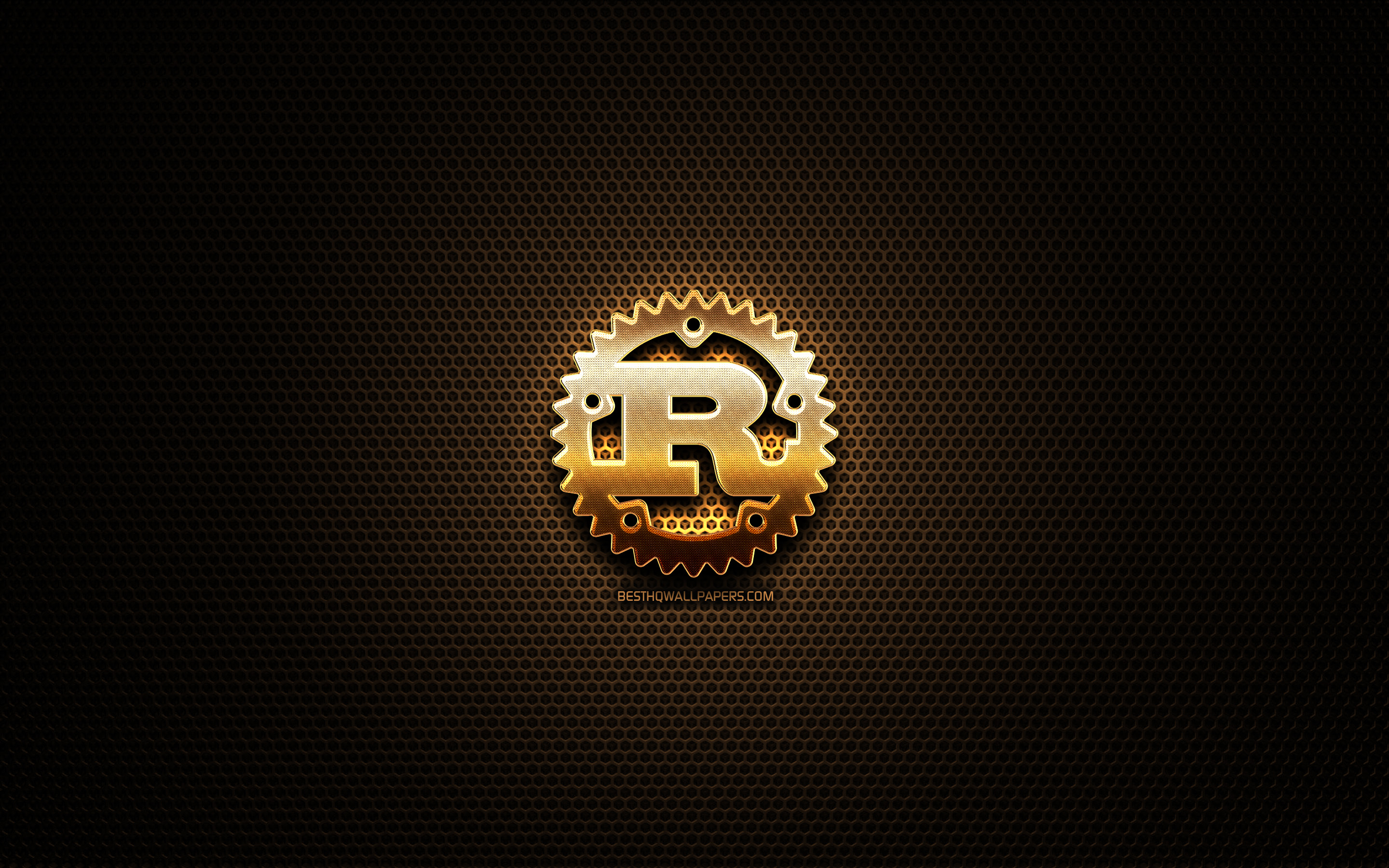 A stunning 4K high-resolution wallpaper featuring the Rust programming language golden glowing logo on a dark hexagonal metal grid background. Perfect for developers and Rust enthusiasts seeking a sleek desktop background.