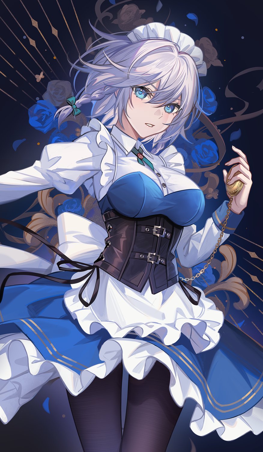 Stunning 4K wallpaper of Sakuya Izayoi from Touhou Project in an elegant blue maid outfit with a corset, holding a pocket watch, surrounded by blue roses on a dark background.
