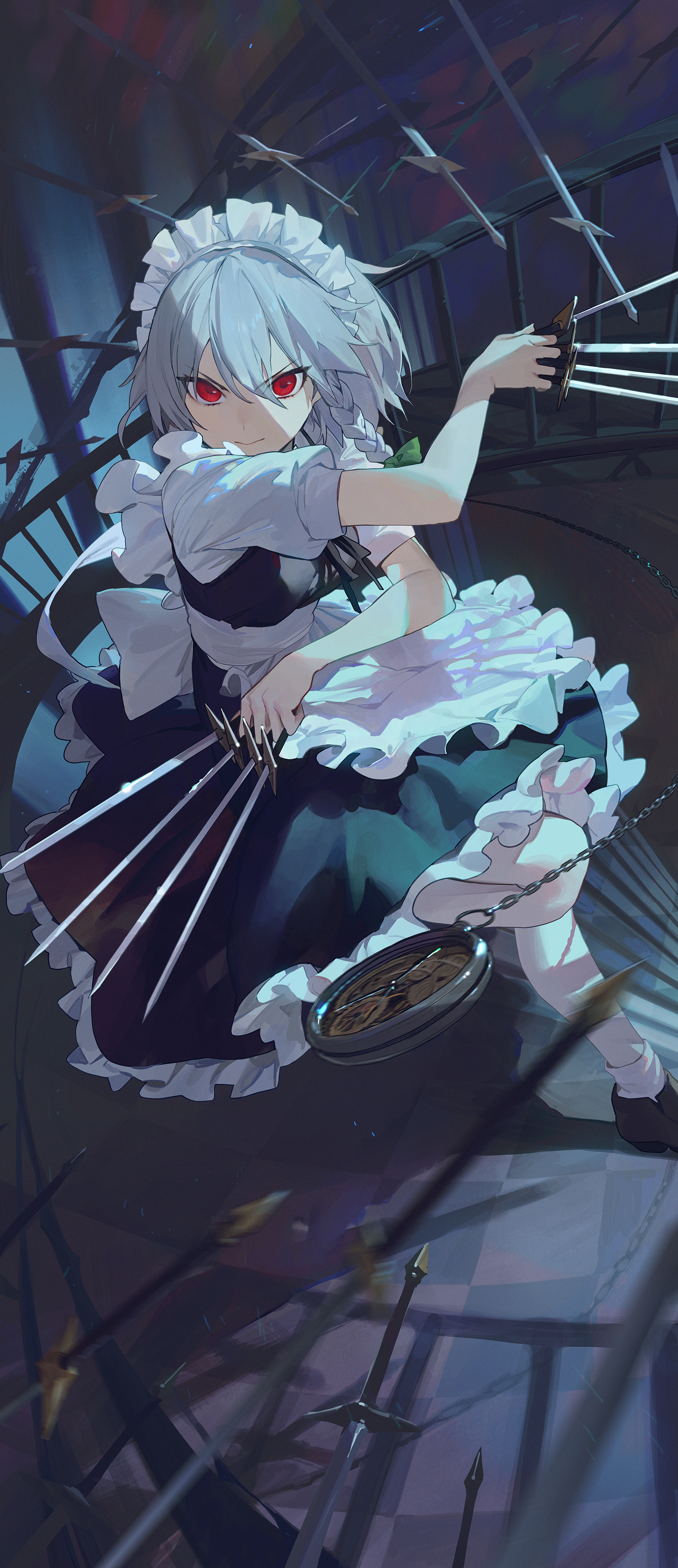 Sakuya Izayoi, Touhou Project, anime wallpaper, 4K wallpaper, maid outfit, silver hair, red eyes, pocket watch, high resolution, anime art