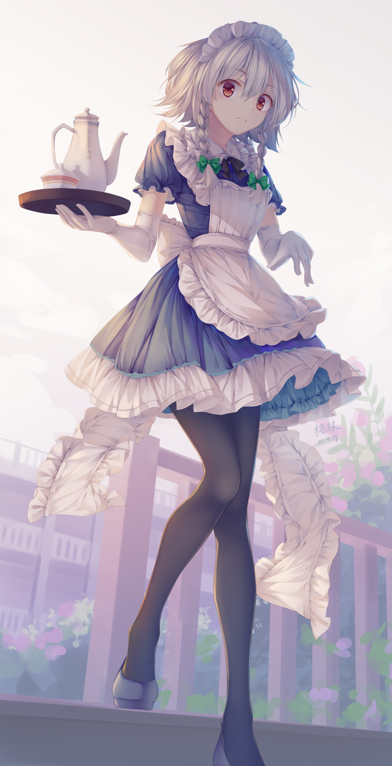 Sakuya Izayoi from Touhou Project in her iconic maid outfit, gracefully carrying a tea tray. High-resolution 4K anime wallpaper featuring detailed frills, green bows, and a serene garden background.