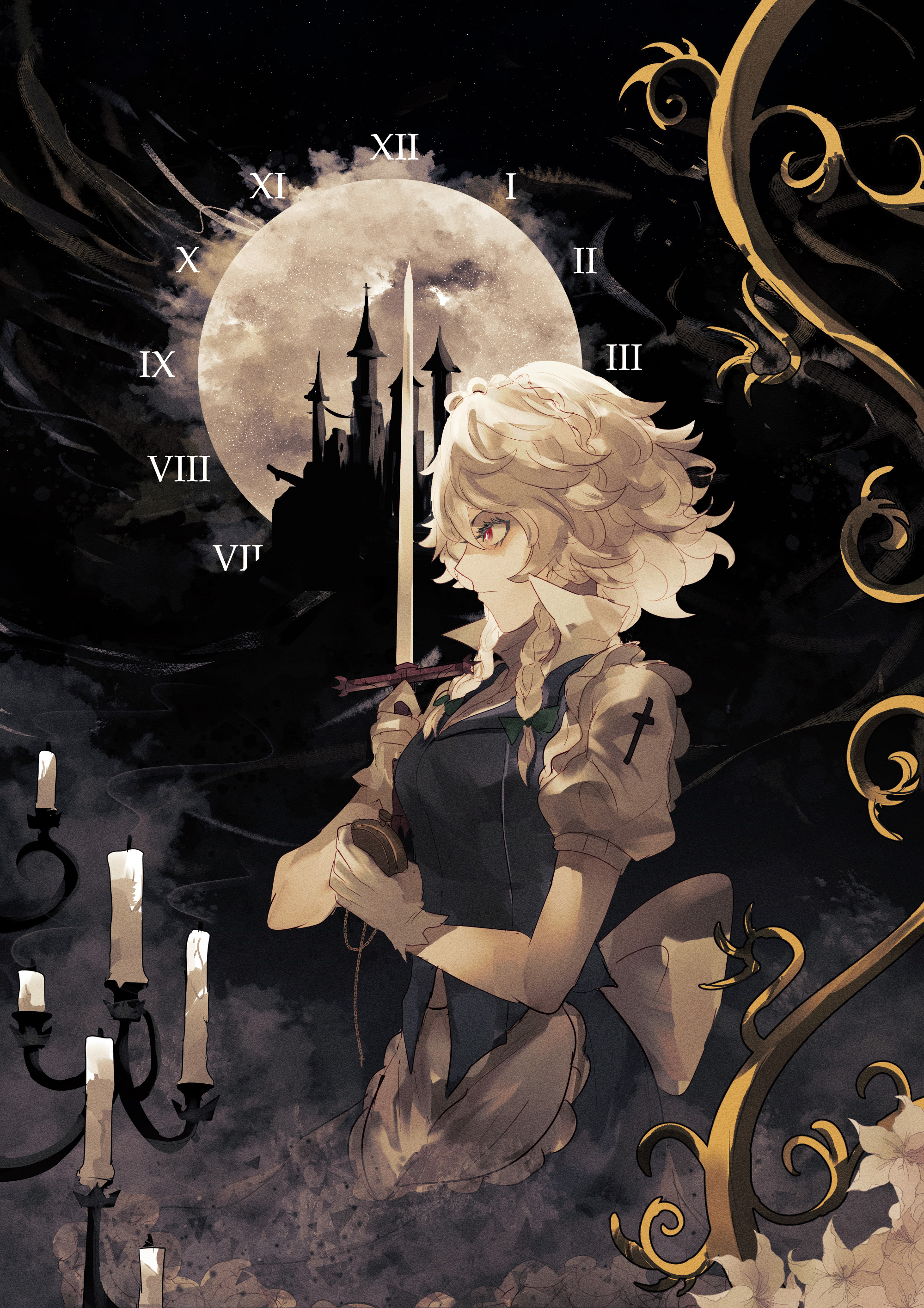Sakuya Izayoi, Touhou Project, anime wallpaper, 4K wallpaper, gothic fantasy, full moon, anime girl, high resolution, dark fantasy, clock maiden