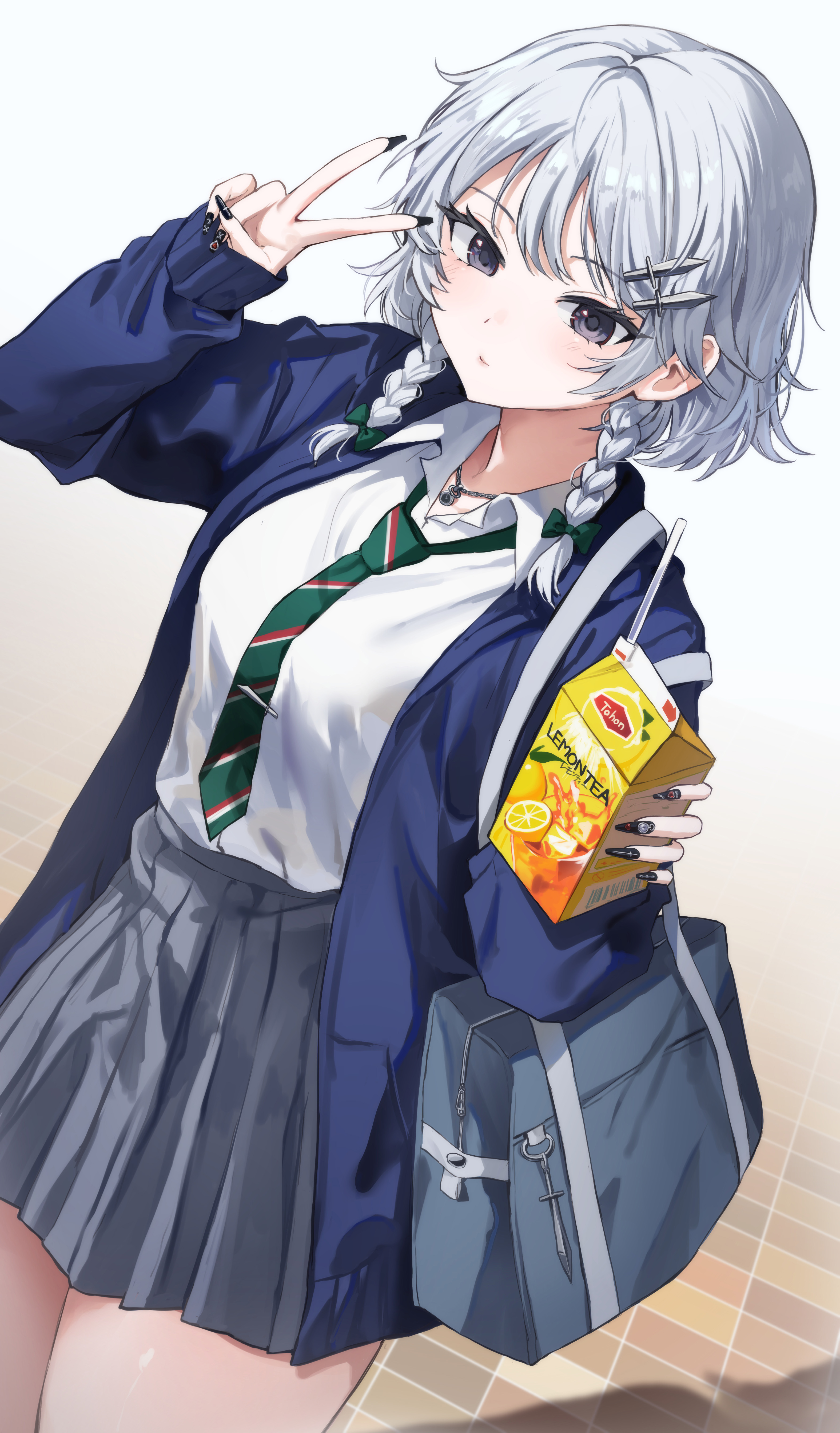 Sakuya Izayoi from Touhou Project dressed in a stylish school uniform with a blue blazer, grey pleated skirt, and braided silver hair, holding a lemon tea carton in 4K high resolution artwork.