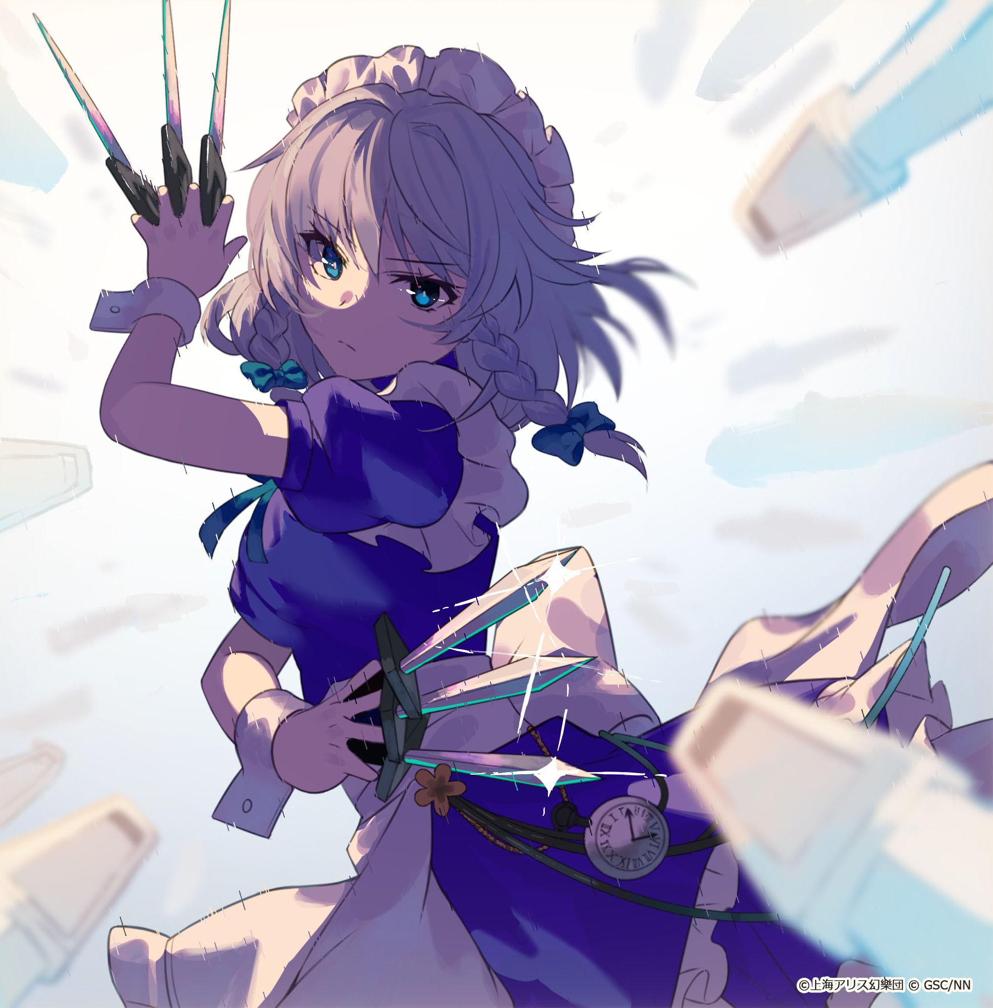 Sakuya Izayoi from Touhou Project in a dynamic battle pose, wielding silver knives with her iconic purple maid outfit and pocket watch. High-resolution anime artwork with stunning detail and vibrant colors.