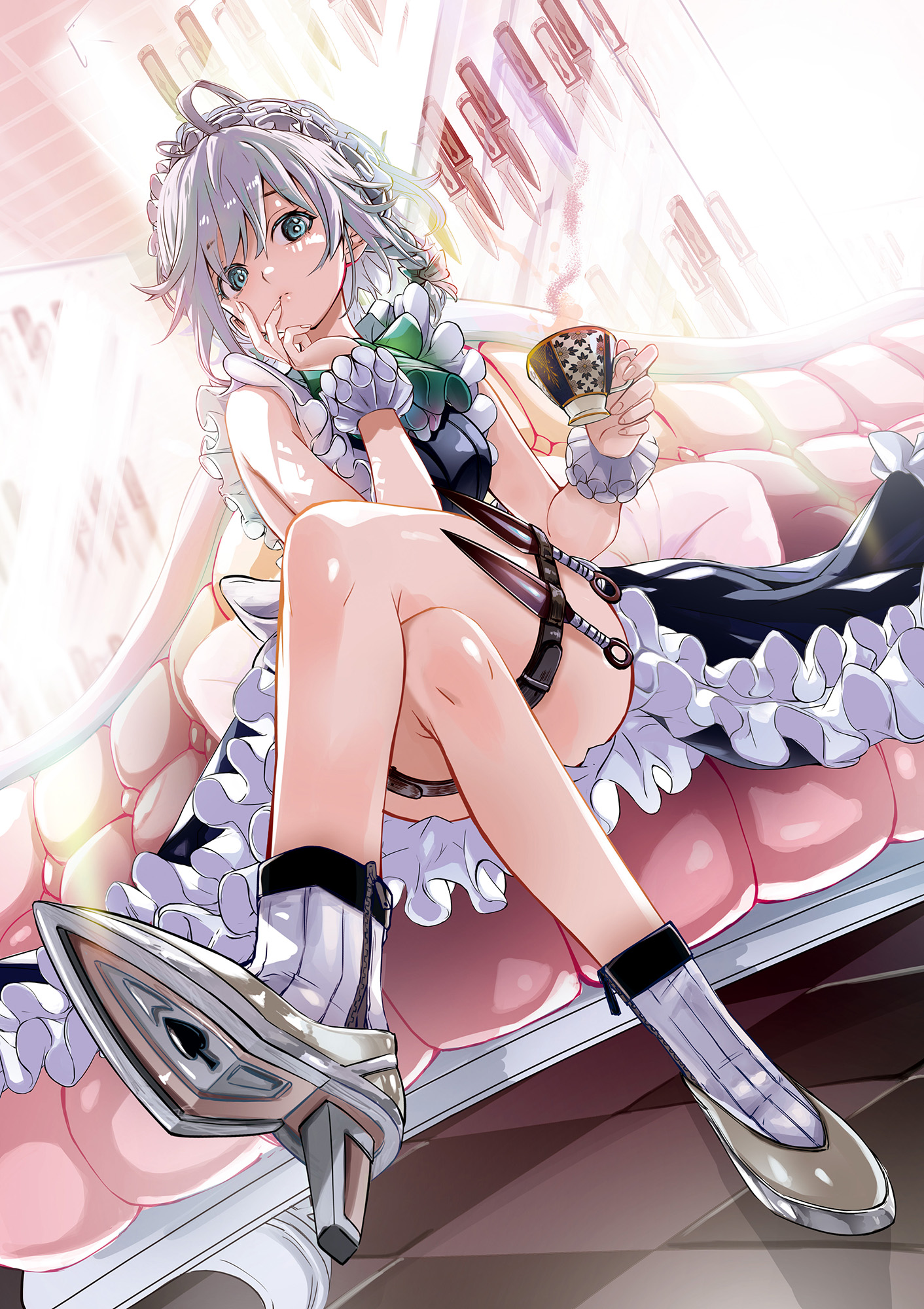 Sakuya Izayoi from Touhou Project sits gracefully on a pink sofa, dressed in her iconic maid outfit with frilled skirt and silver armor boots, holding a teacup in a beautifully detailed high-resolution anime artwork.