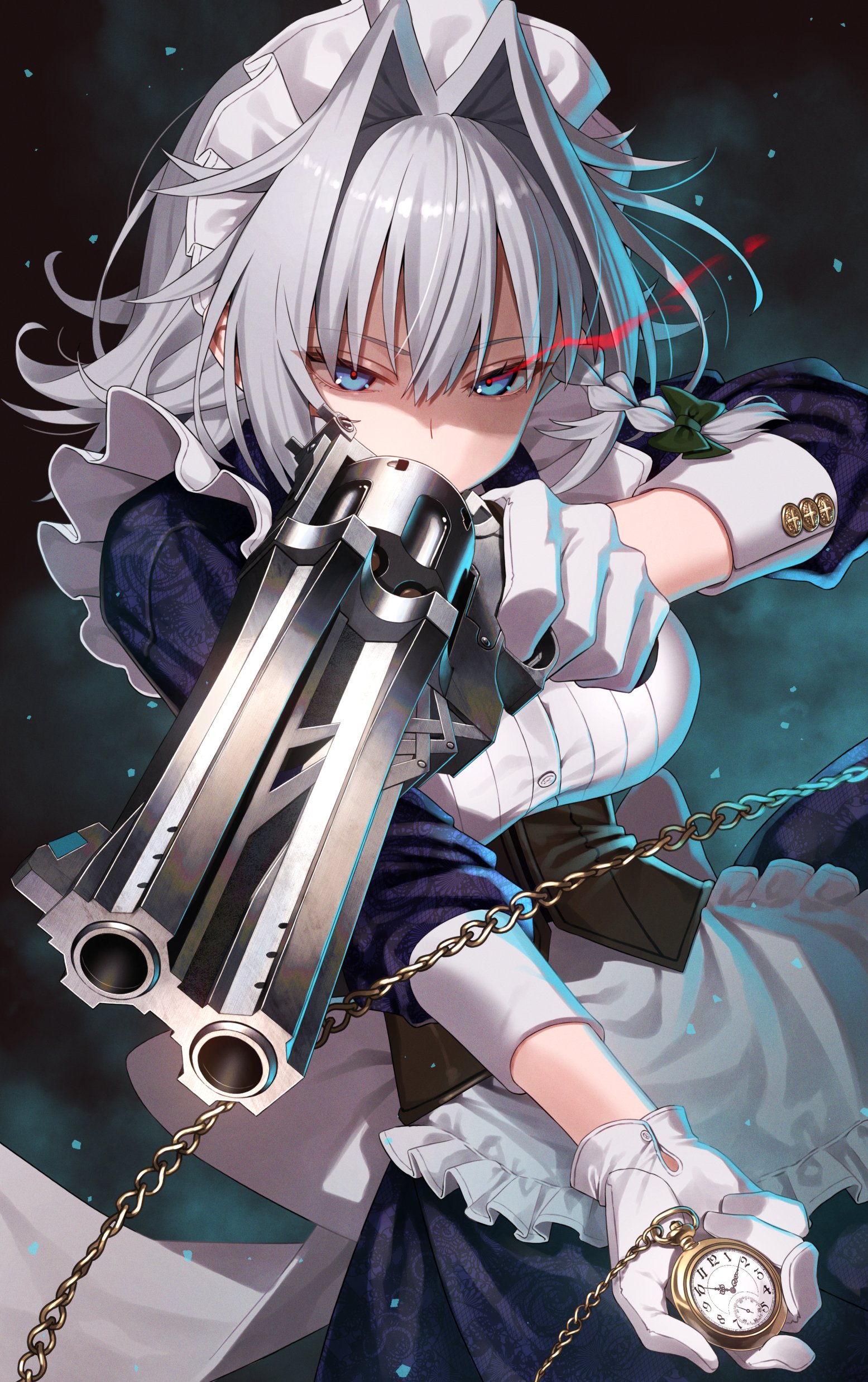 Sakuya Izayoi from Touhou Project wielding a massive double-barrel revolver with intense blue eyes, silver hair, maid outfit, white gloves, and a pocket watch chain in stunning 4K detail.