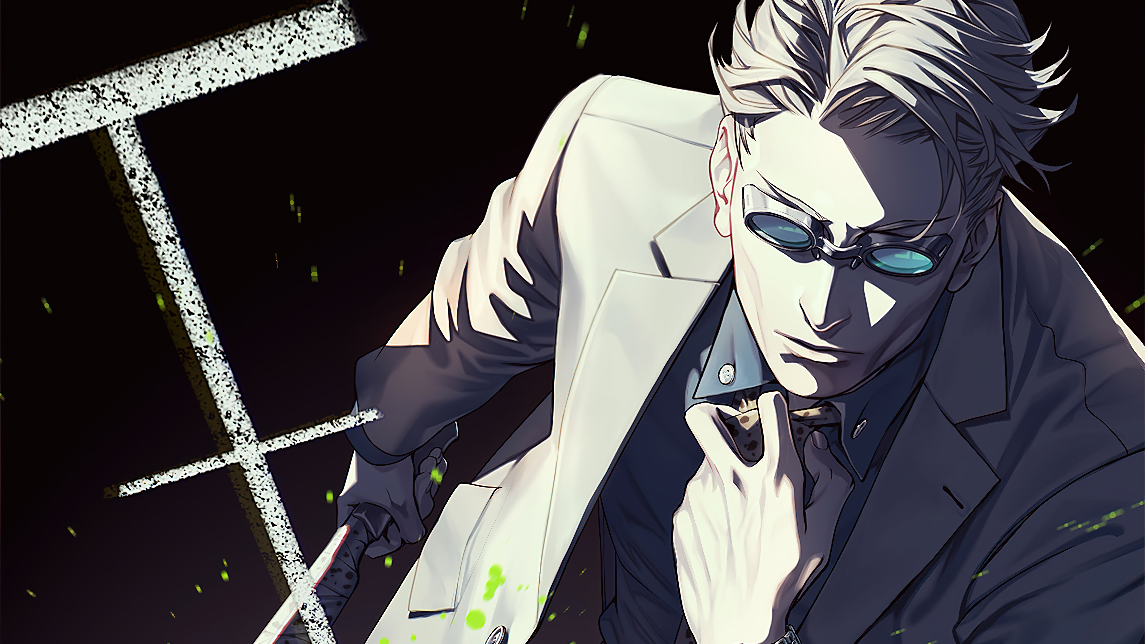 Stunning 4K wallpaper featuring Satoru Gojo from Jujutsu Kaisen in his iconic white suit and blue tinted glasses. Dark atmospheric background with green particles enhances his menacing and powerful presence.