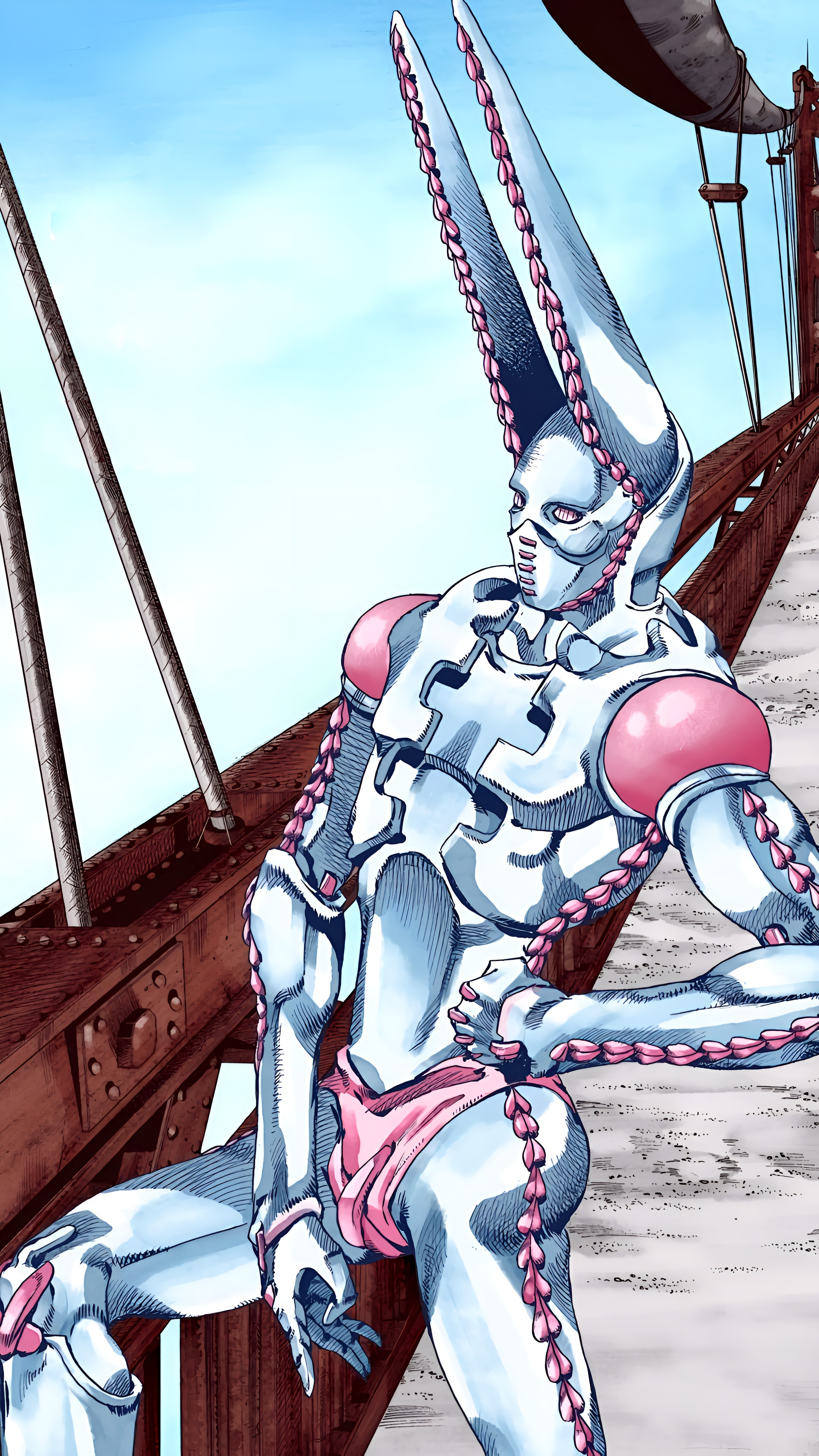 High-resolution artwork of a powerful Stand from JoJo's Bizarre Adventure: Steel Ball Run, featuring a sleek white and pink robotic figure seated on a rustic iron bridge under a clear blue sky.