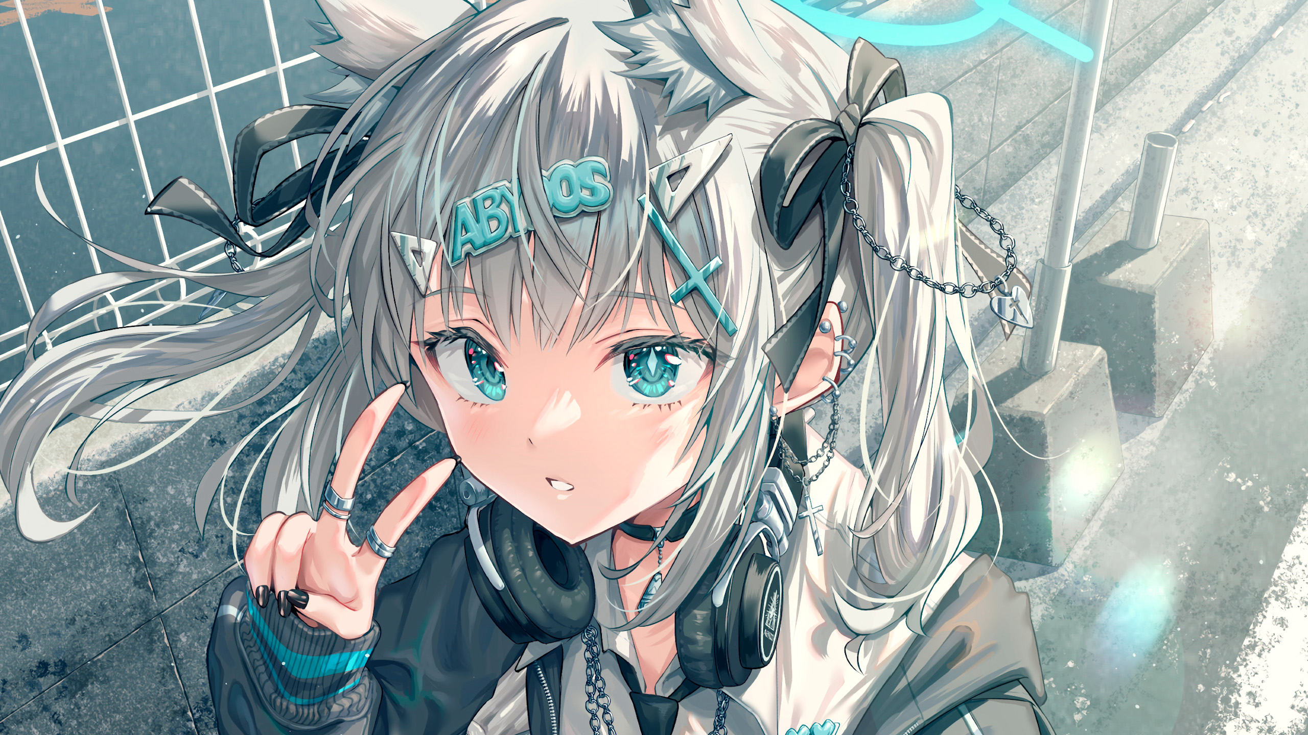 Stunning 4K wallpaper of Shiroko Sunaookami from Blue Archive, featuring her iconic silver twin-tails, teal eyes, wolf ears, black headphones, and edgy urban streetwear style with a playful peace sign pose.