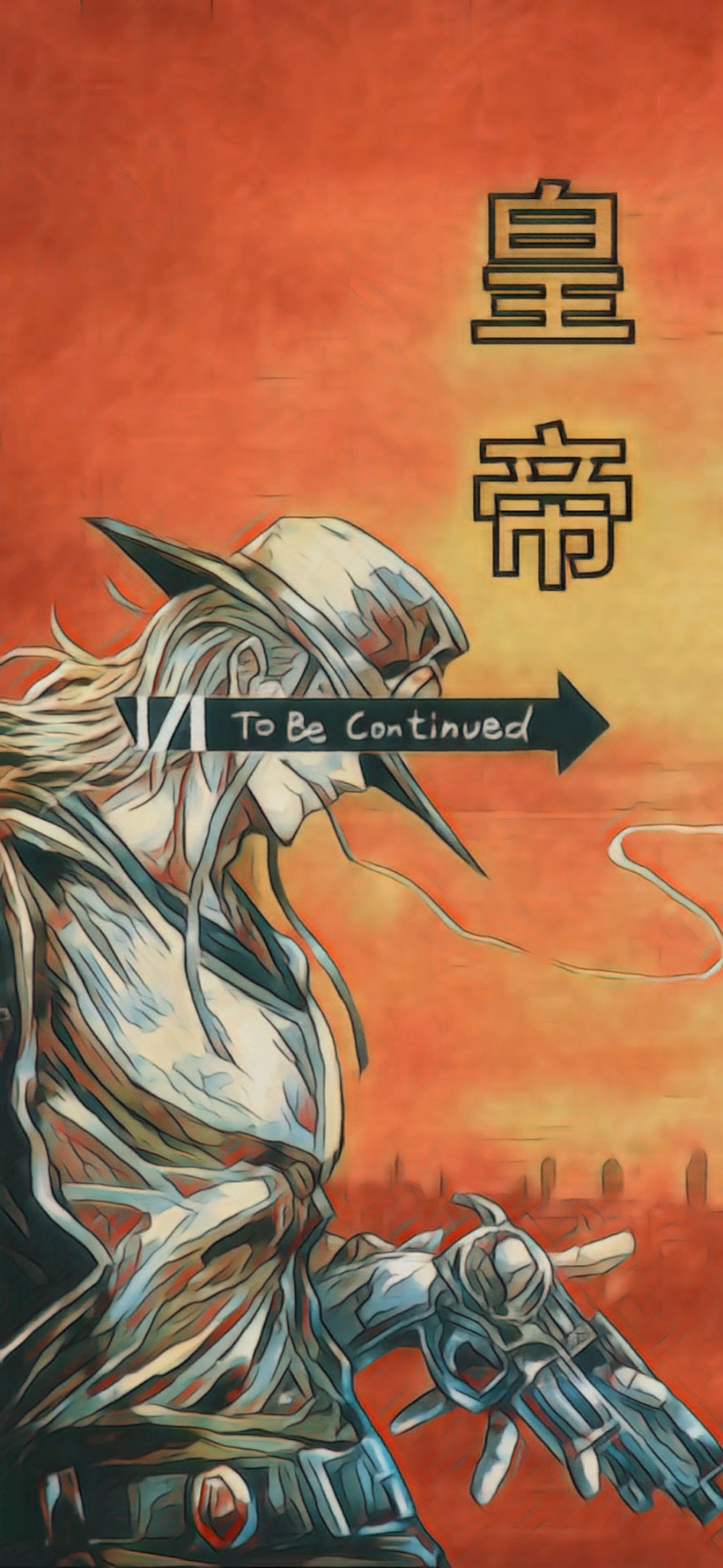 Stunning 4K wallpaper featuring a character from JoJo's Bizarre Adventure: Steel Ball Run with the iconic 'To Be Continued' arrow, set against a dramatic orange sunset background with Japanese kanji characters.