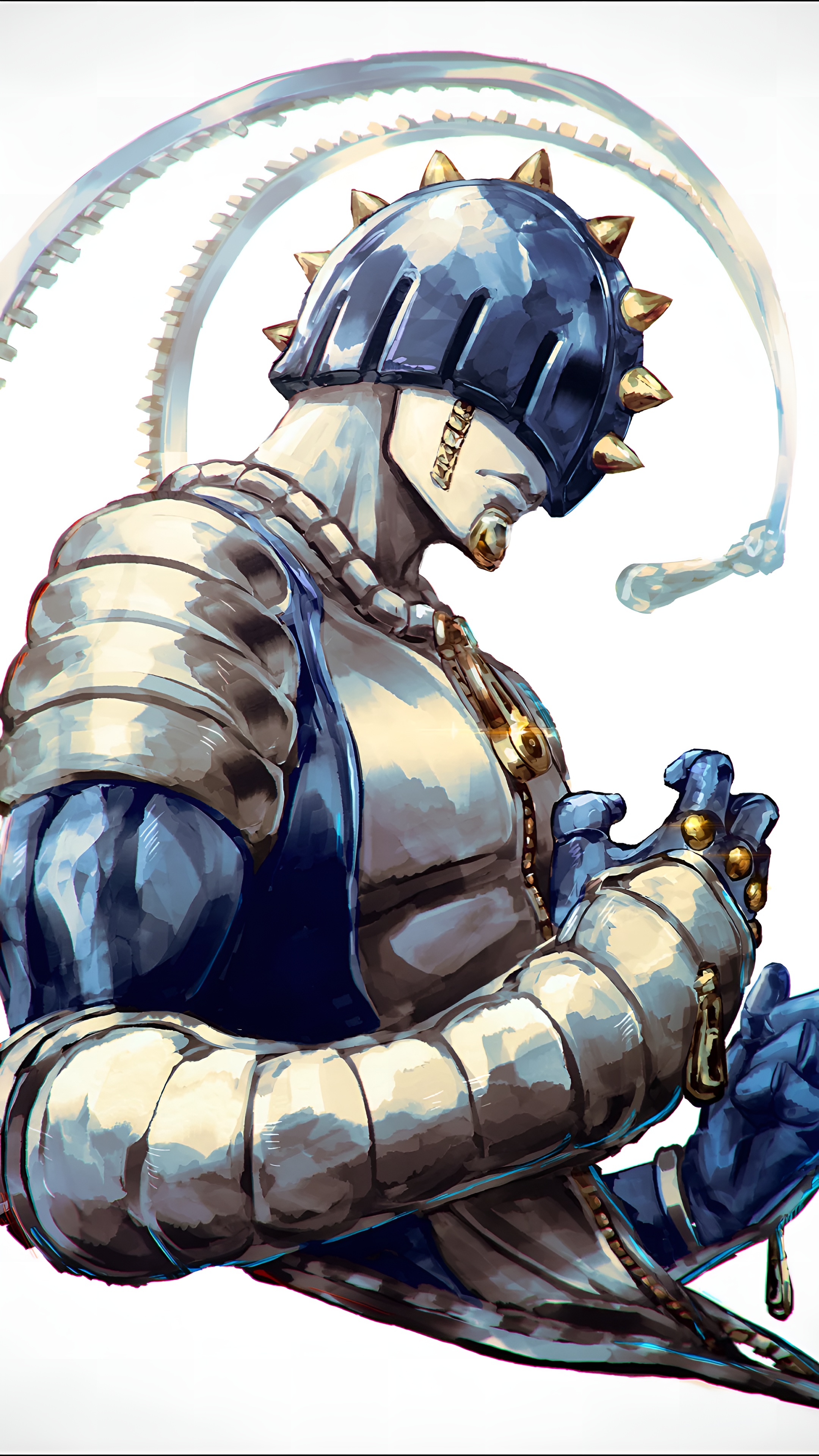High-resolution 4K wallpaper featuring Sticky Fingers, the iconic Stand from JoJo's Bizarre Adventure. Detailed artwork showcases its spiked helmet, segmented armor, blue gloves, and signature zipper motif in stunning clarity.