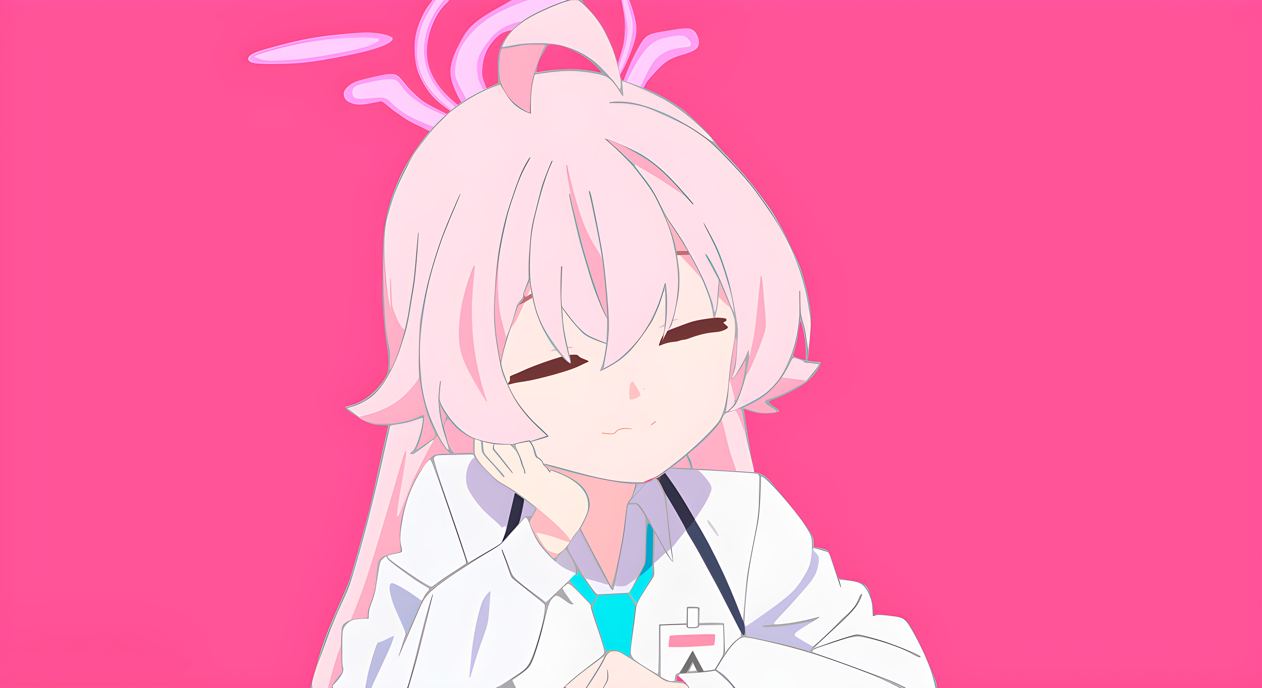 Stunning 4K wallpaper of Takanashi Hoshino from Blue Archive, featuring her iconic pink hair, halo, and white lab coat against a vibrant pink background. Perfect for desktop and mobile screens.