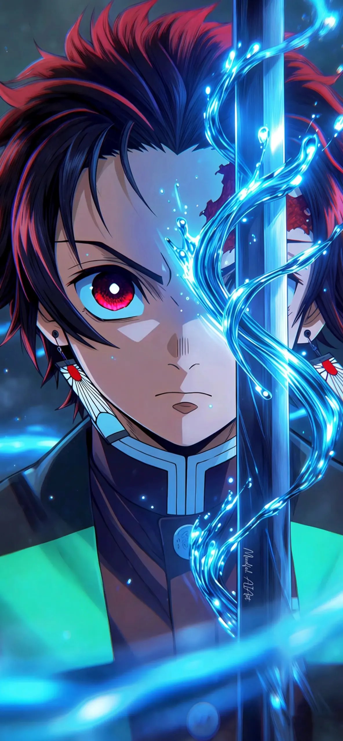 Stunning 4K wallpaper of Tanjiro Kamado from Demon Slayer, featuring his glowing red eyes, iconic hanafuda earrings, and a luminous blue water-breathing sword effect on a dark atmospheric background.