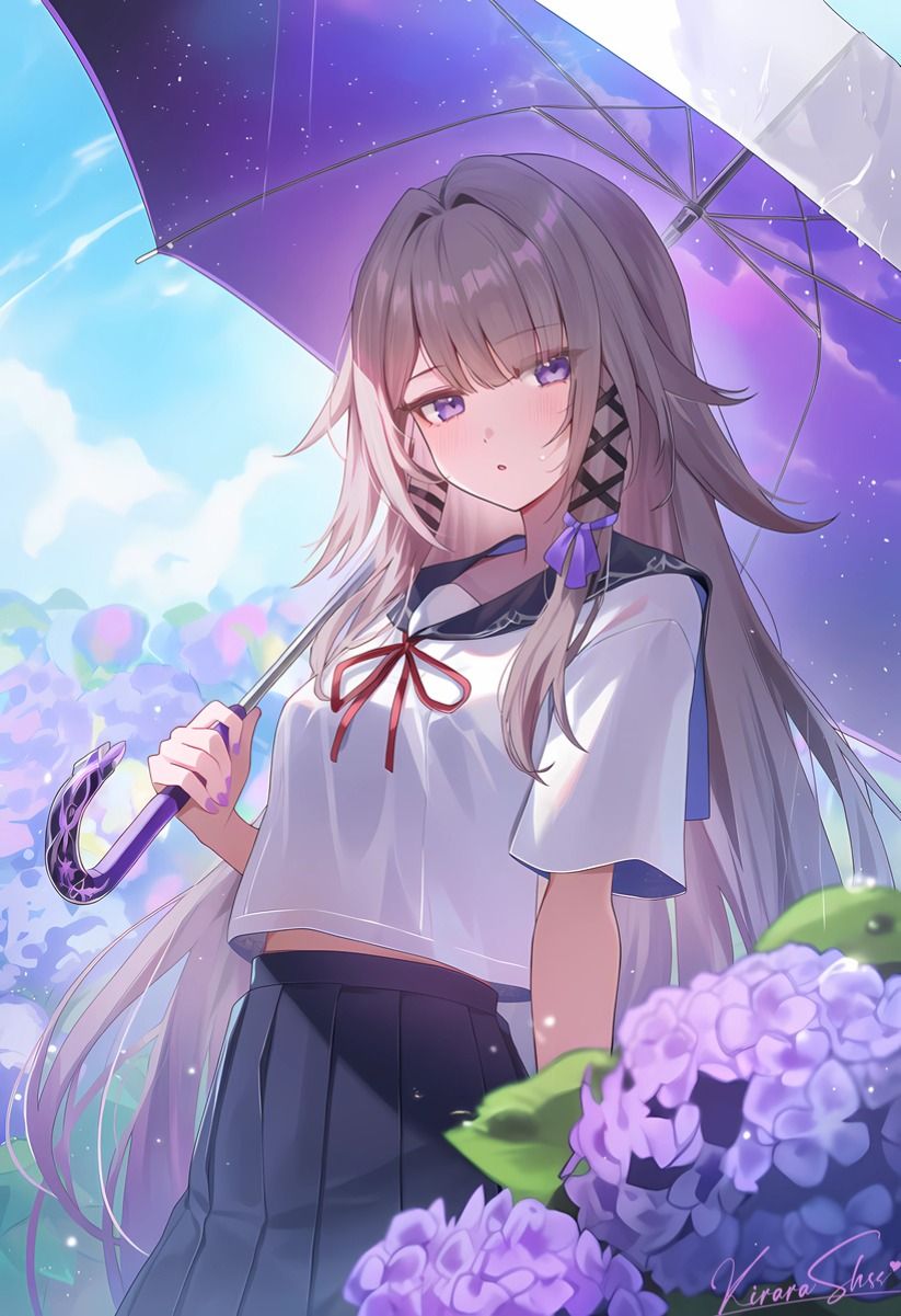 The Herta wallpaper, Honkai Star Rail wallpaper, 4K anime wallpaper, high resolution anime girl, purple umbrella anime, hydrangea anime art, Honkai Star Rail fanart, anime school uniform, ultra HD wallpaper, Keroro Shii art