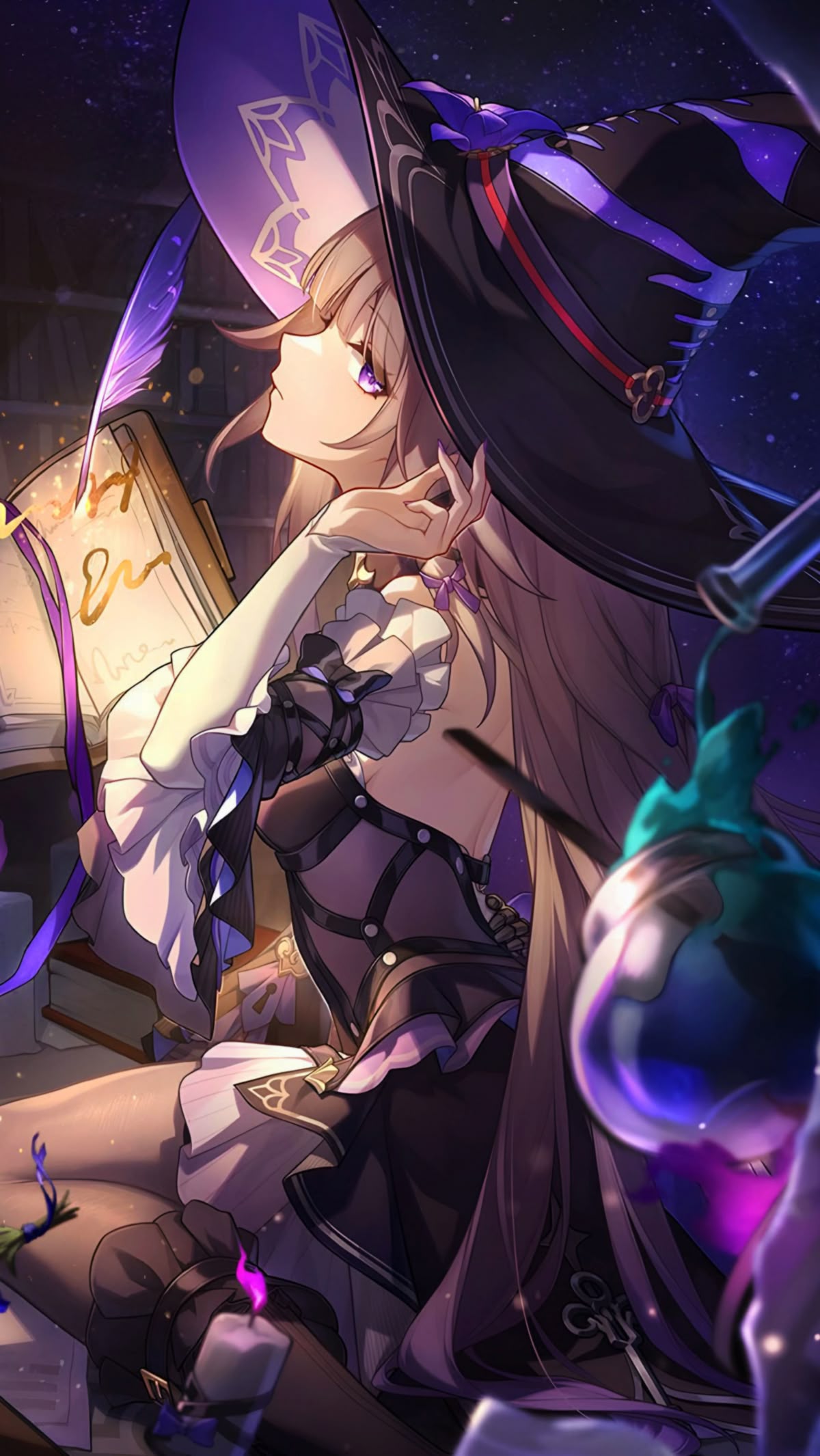 Stunning 4K wallpaper of The Herta from Honkai: Star Rail, depicted as an elegant witch studying a glowing spellbook. Features purple magical elements, a black witch hat, and enchanting potion in a beautifully detailed high-resolution artwork.