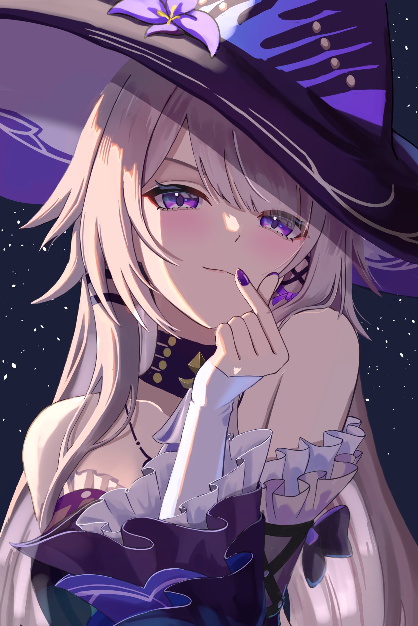 Stunning 4K wallpaper of The Herta from Honkai: Star Rail, featuring her iconic purple witch hat, silver hair, violet eyes, and elegant ruffle outfit against a starry dark background.