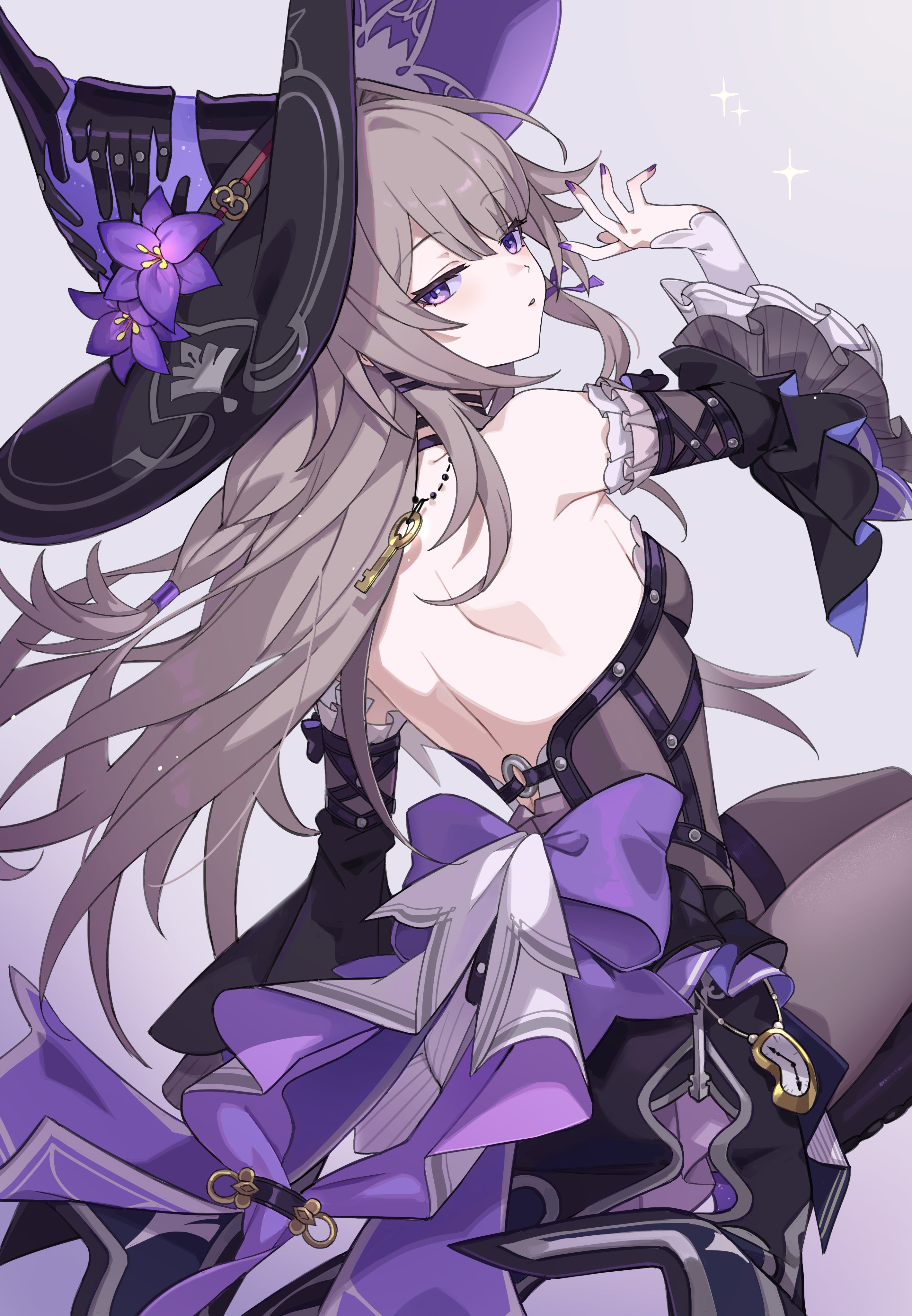 Stunning 4K wallpaper of The Herta from Honkai: Star Rail, featuring her iconic purple witch hat, flowing gray hair, violet eyes, and elegant dark fantasy outfit adorned with golden key accessories.