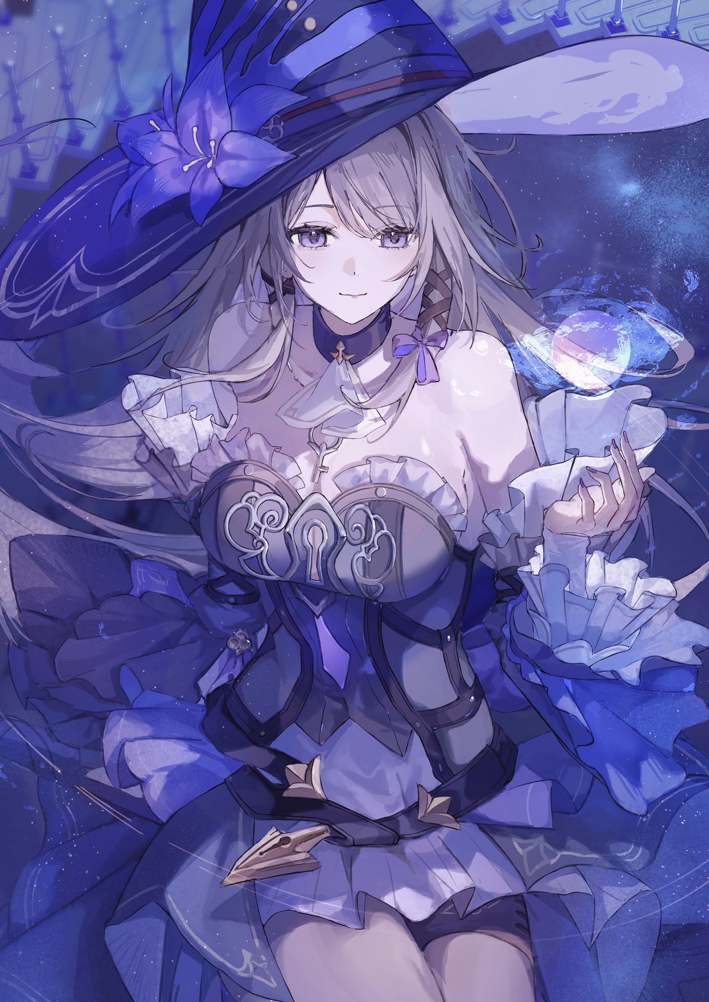 Stunning 4K wallpaper of The Herta from Honkai: Star Rail, featuring her iconic blue witch hat, elegant armor corset, and glowing magical orb. High-resolution fan art with a dreamy blue aesthetic.