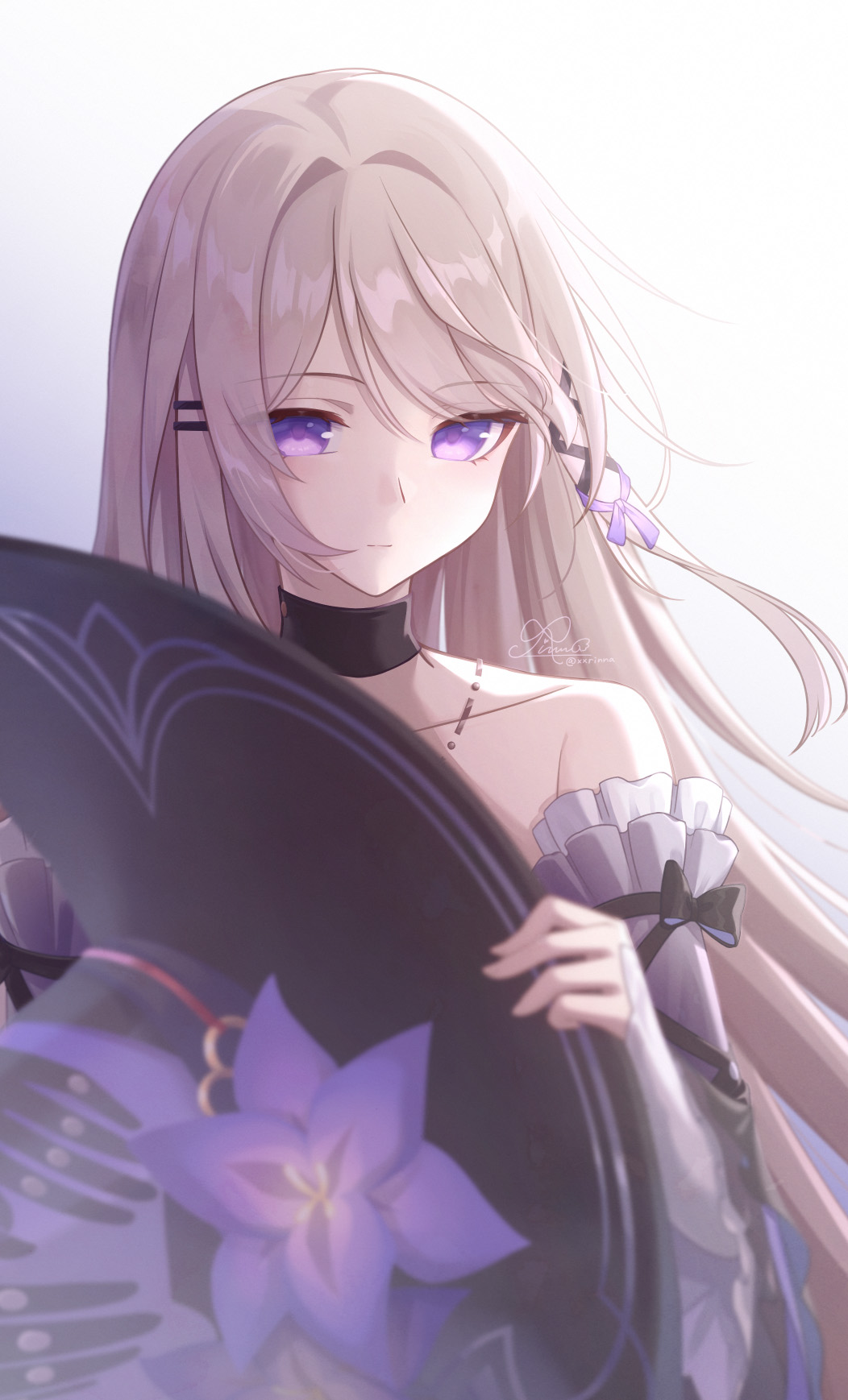 Stunning 4K wallpaper of The Herta from Honkai: Star Rail, featuring her elegant silver hair, piercing purple eyes, dark outfit, and a decorative fan with purple flowers. High resolution fan art.