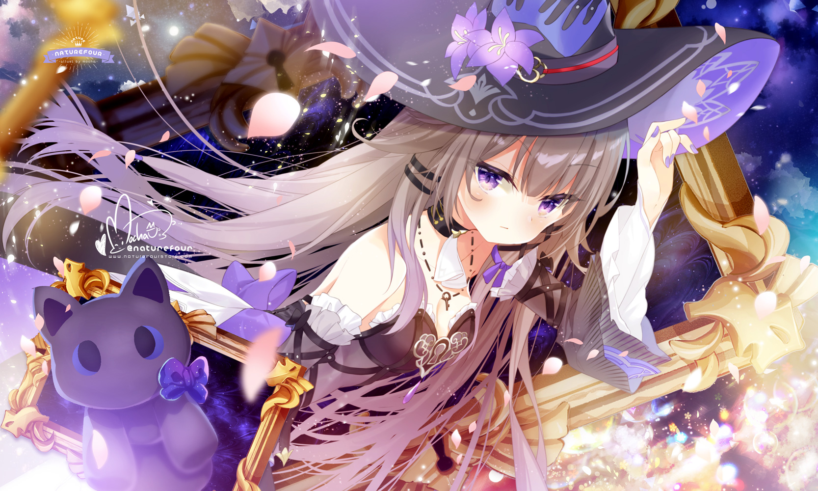 Stunning 4K high-resolution wallpaper of The Herta from Honkai: Star Rail, depicted as a mystical witch riding a broom under a moonlit sky, surrounded by magical petals and a cute black cat familiar.